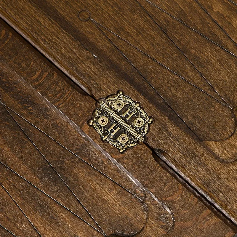 Производитель внимательно относится к своим изделиям и старается сделать их уникальными. Каждая из внешних поверхностей украшается геометрическими и символическими узорами. На лицевой створке имеется изображение того самого узора из Армении, выполненного в уникальной манере автора. Это полностью ручная работа, но сделана она очень скрупулезно, со вниманием к каждой детали, и максимально аккуратно. Даже петли и крючки, здесь вылиты из бронзы в специальной форме с украшением и эмблемой производителя, в форме латинской буквы H.