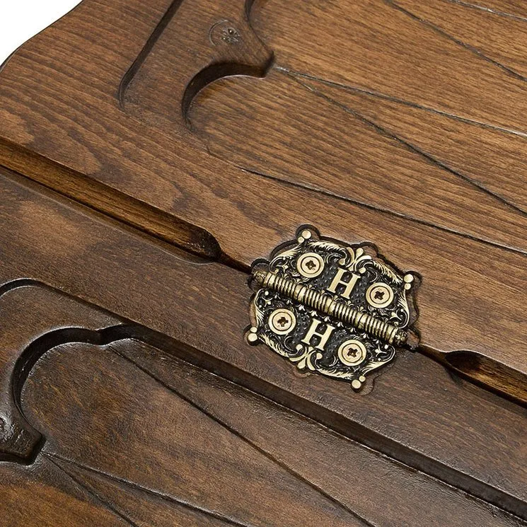 На лицевой поверхности вырезано изображение гуляющего льва, а вокруг него выполнен узор в виде лаврового венка и множество мелкой текстуры. С обратной стороны имеется поле для игры в шашки, для чего можно будет использовать комплектные фишки. Изнутри все более минималистично – треугольники около каждой ячейки и подчеркнутая деревянная текстура. На петлях имеется изображение эмблемы мастера в виде буквы H. В комплекте имеется мягкий тканевый чехол, который поможет при транспортировке и длительном хранении, защищая от вибрации и попадания пыли и грязи.