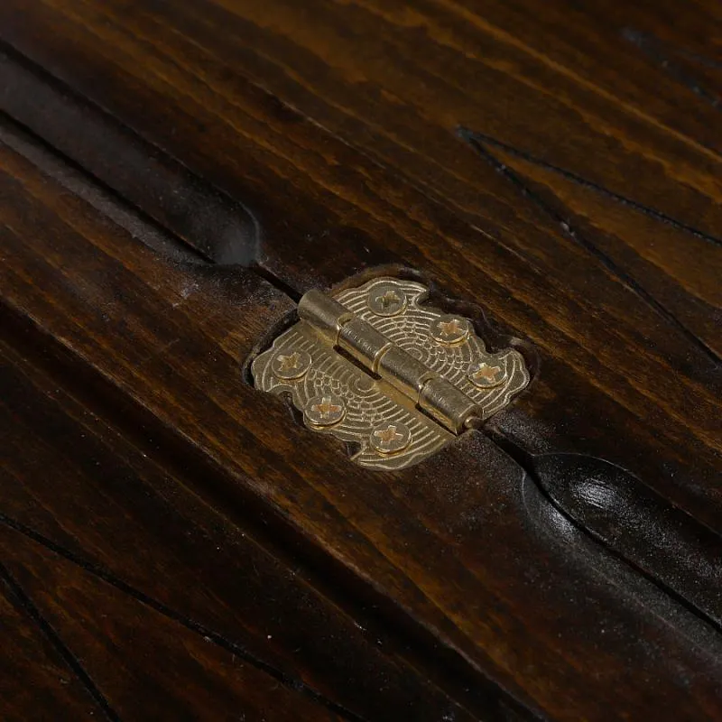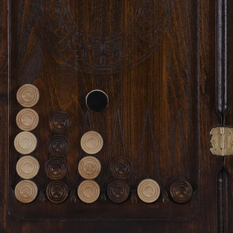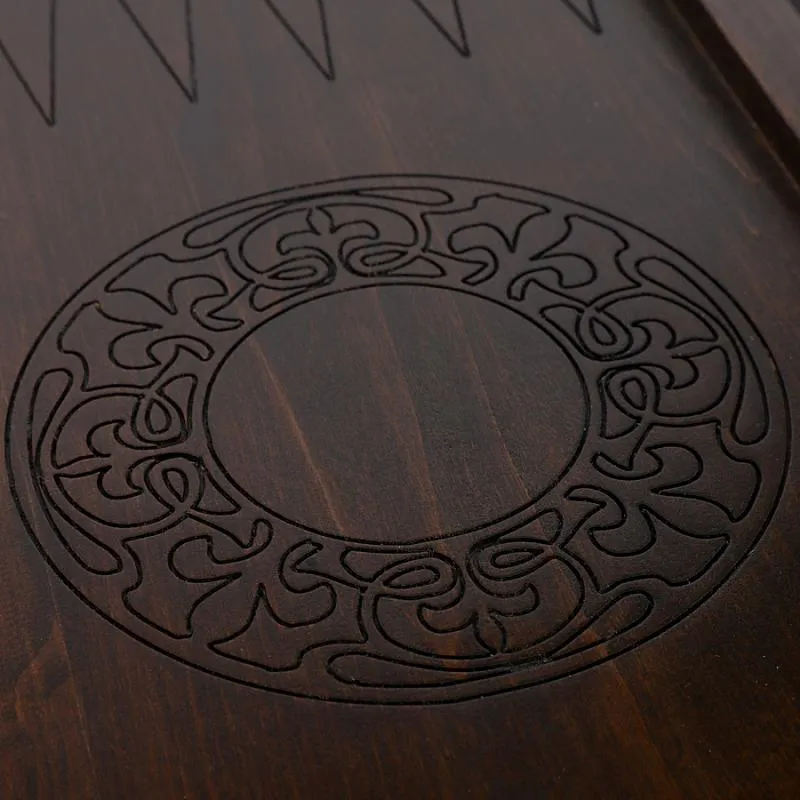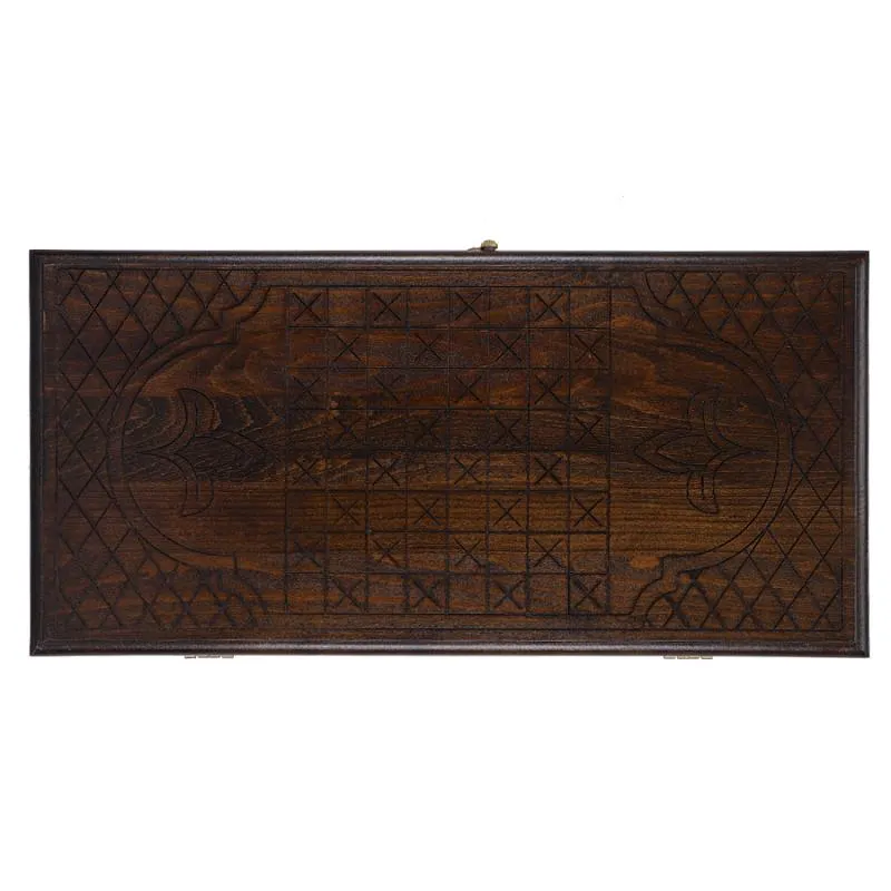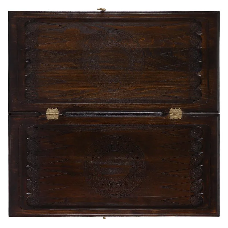 Внутренняя часть доски, также украшенная красивыми резными узорами, предназначена для игры в нарды. Части доски скрепляются надежной медной фурнитурой, которая обеспечивает конструкции износостойкость и долговечность. От образования трещин и потертостей доску защищает лаковое покрытие.