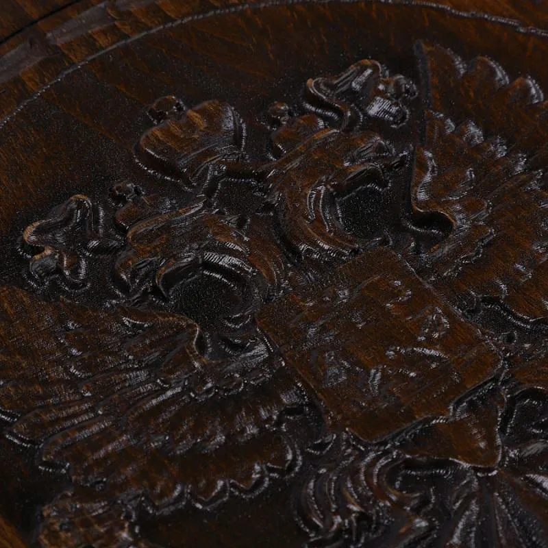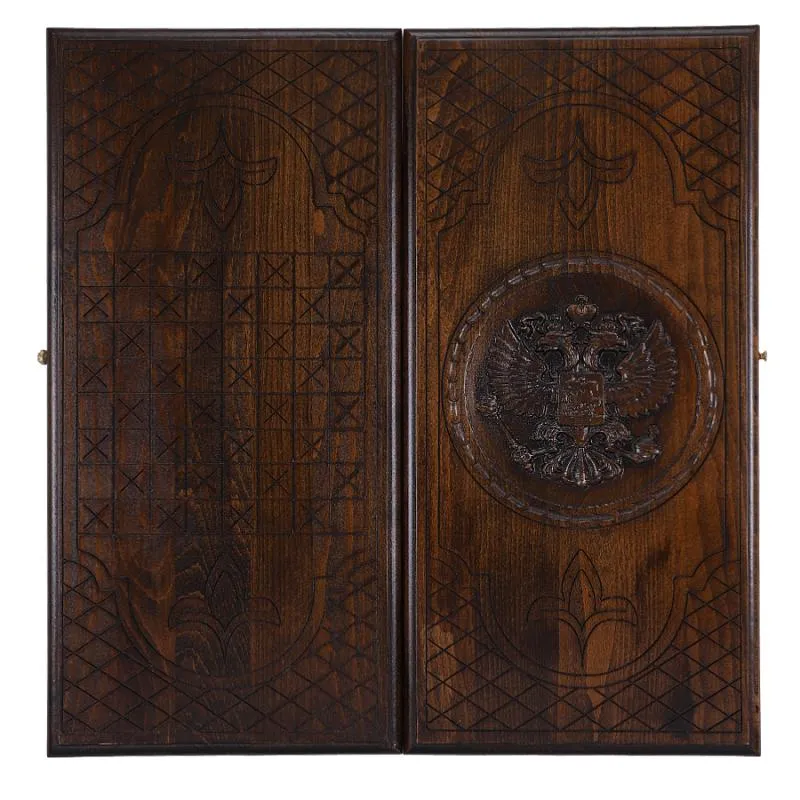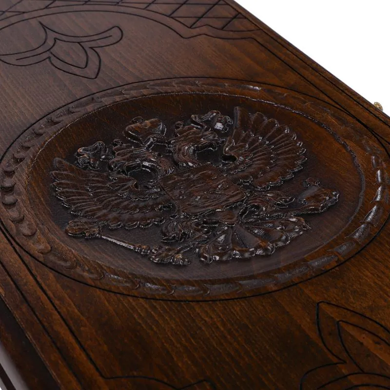 Нарды резные "Герб РФ-2" – невероятно красивый и качественный набор классической настольной игры, выполненный из натуральной буковой древесины известным талантливым мастером. Верхнюю крышку доски гордо украшает резной герб РФ – один из главных государственных символов страны. На задней крышке нанесено поле для шахмат или шашек.