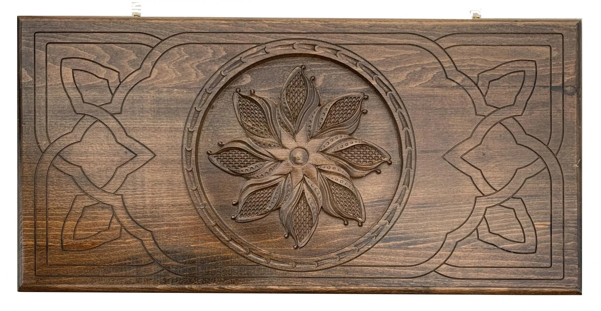 С внешней стороны доска украшена резным цветочным узором и полем для игры в шашки. Внутренний разворот – поле для нард, на котором также присутствует абстрактный витиеватый узор. Части доски скреплены между собой устойчивыми к износу медными петлями. От царапин деревянную поверхность защищает лак и подложки на каждой фишке.