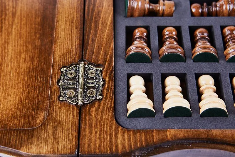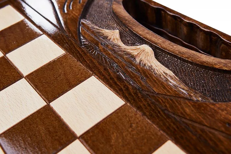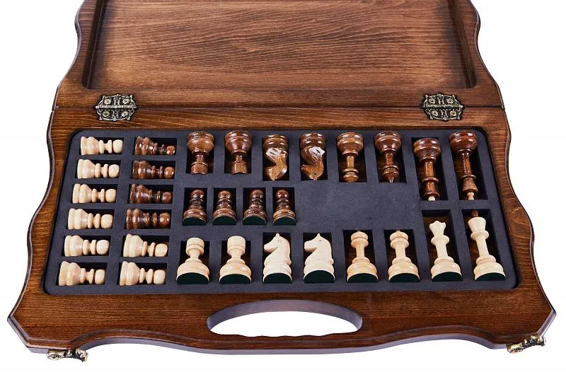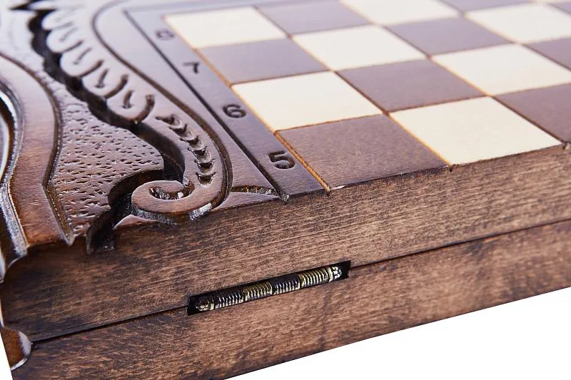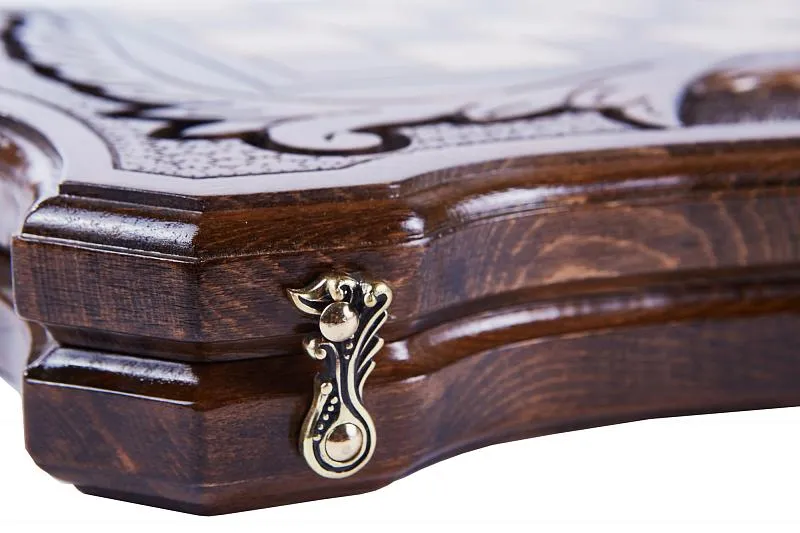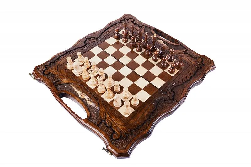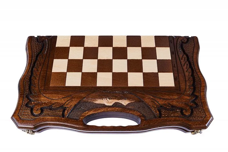 Резные шахматы «Арарат» с ручкой и ложементом – произведение искусства от известного армянского мастера. Выполненные из высококачественной натуральной буковой древесины, шахматы поражают детализацией и проработанностью каждого элемента. Фигуры, выполненные в классическом для шахмат стиле, имеют специальную подложку, предотвращающую царапание доски. Сама же доска складывается, держась на износостойких нержавеющих петлях. Удобство транспортировки обеспечивается наличием ручки, вырезанной в самой доске.