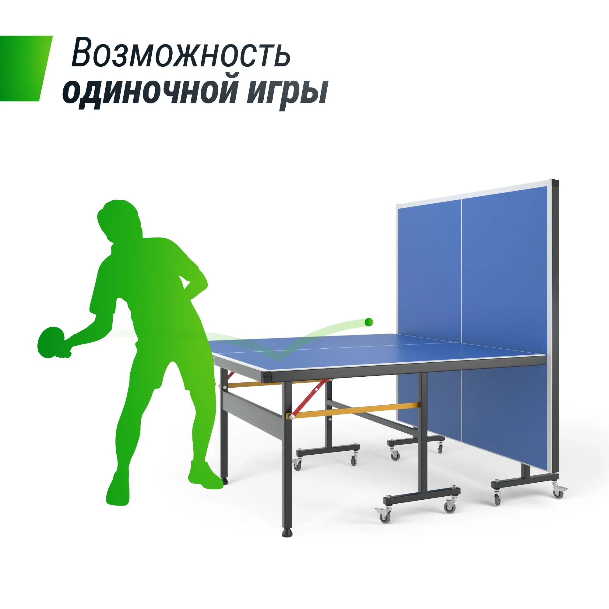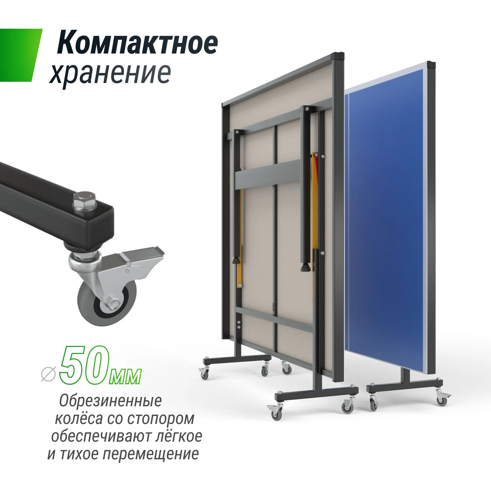 Для комфортного перемещения теннисный стол имеет 8 прорезиненных колес Ø75 мм с подшипниками. Все колеса маневровые и обладают высокой износостойкостью, 4 из них оборудованы фиксаторами.