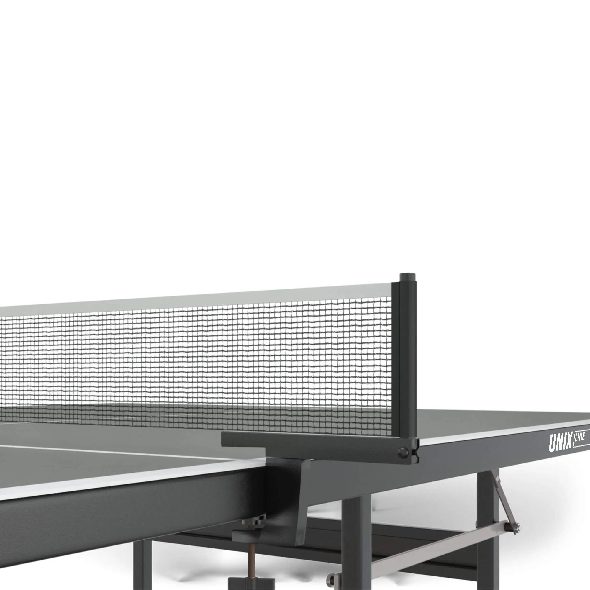 Металлическая рама теннисных столов UNIX Line имеет толщину стали 1,7 мм, размер профиля опор составляет 30х30 мм. Благодаря таким характеристикам конструкции рамы, теннисный стол сохраняет жесткость и устойчивость на любых покрытиях. Опоры теннисного стола оборудованы компенсаторами неровности.