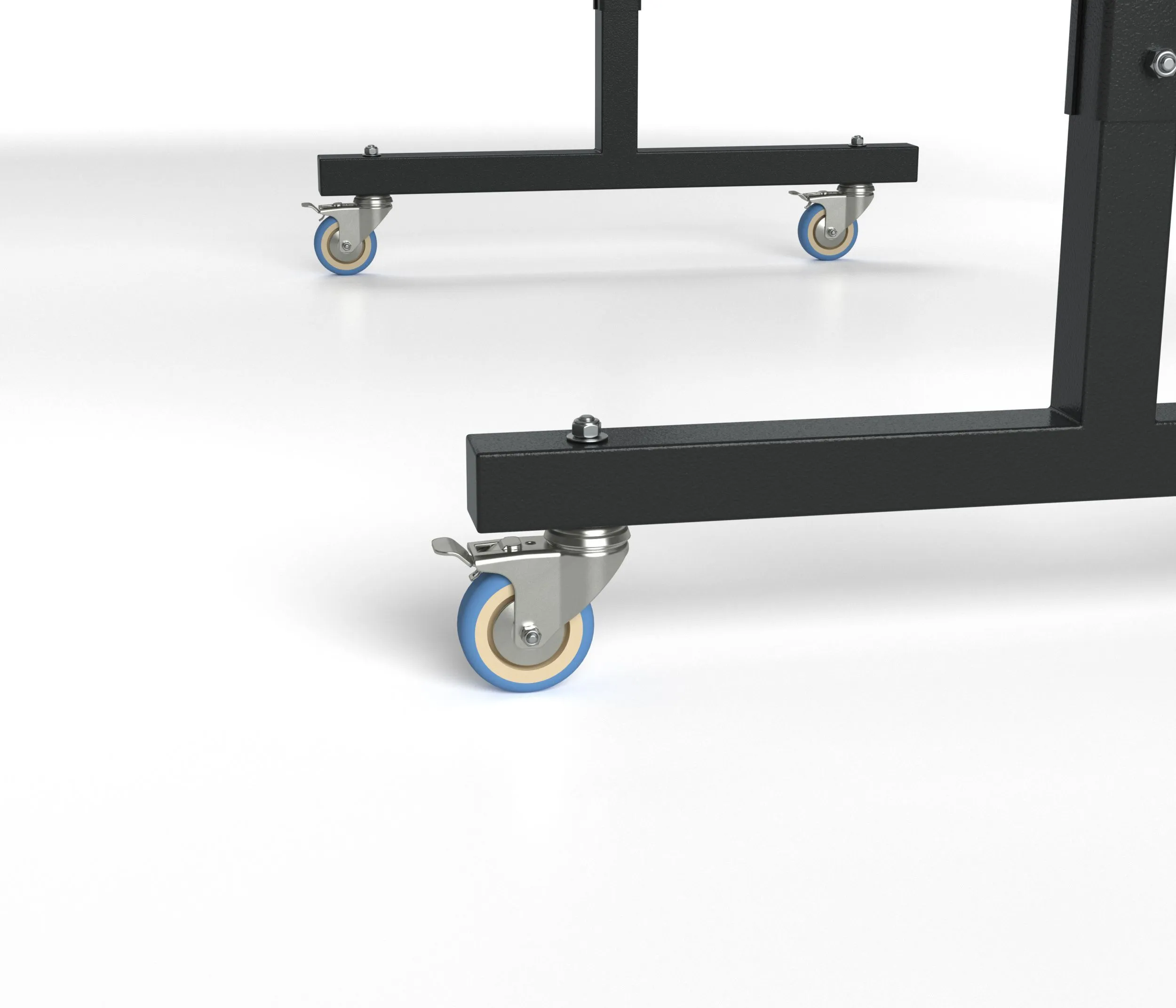 Транспортировочные колеса диаметром 55 мм, которых здесь 8 штук, являются маневровыми и обрезиненными. Это делает перемещение стола легким и плавным, даже по неровным поверхностям.