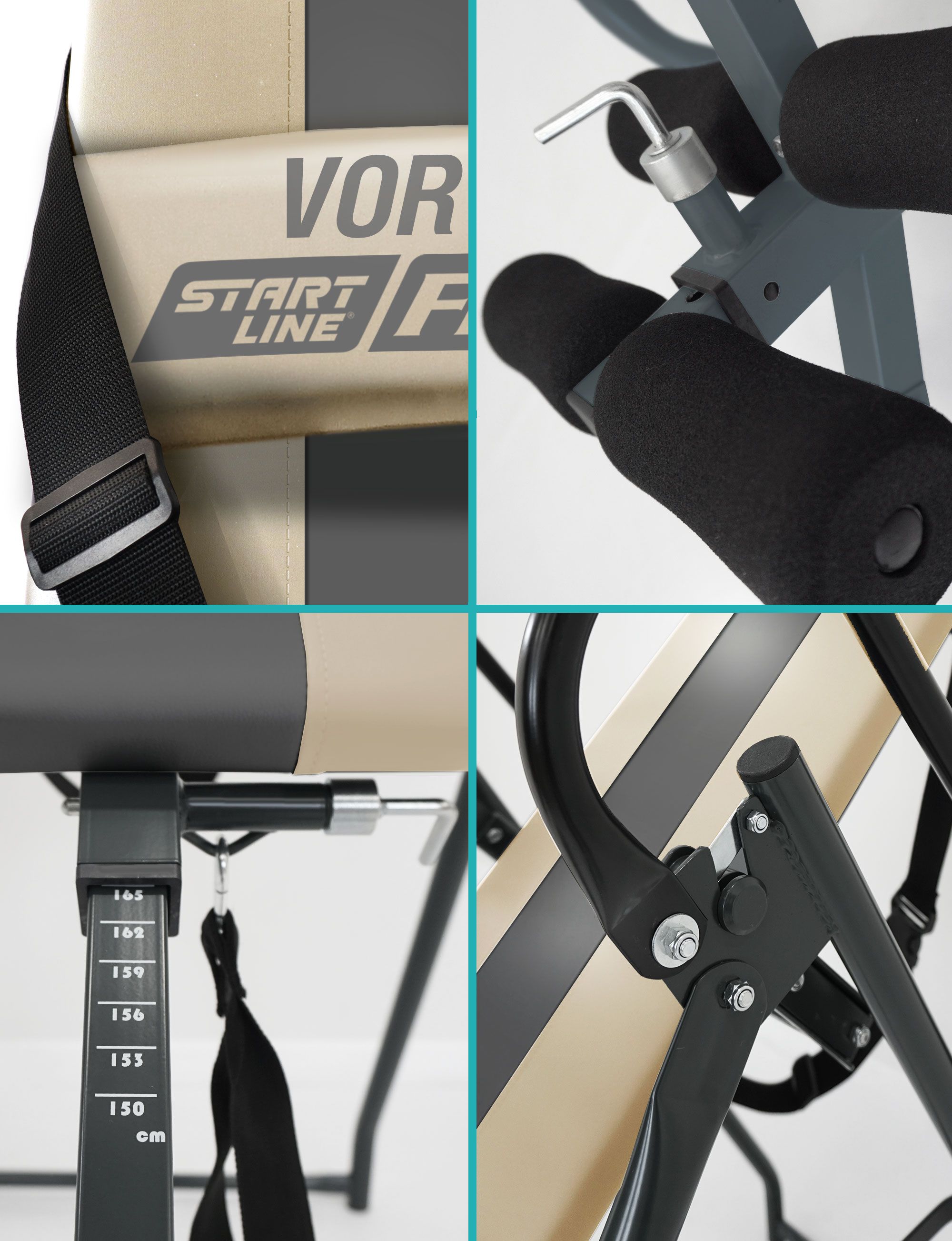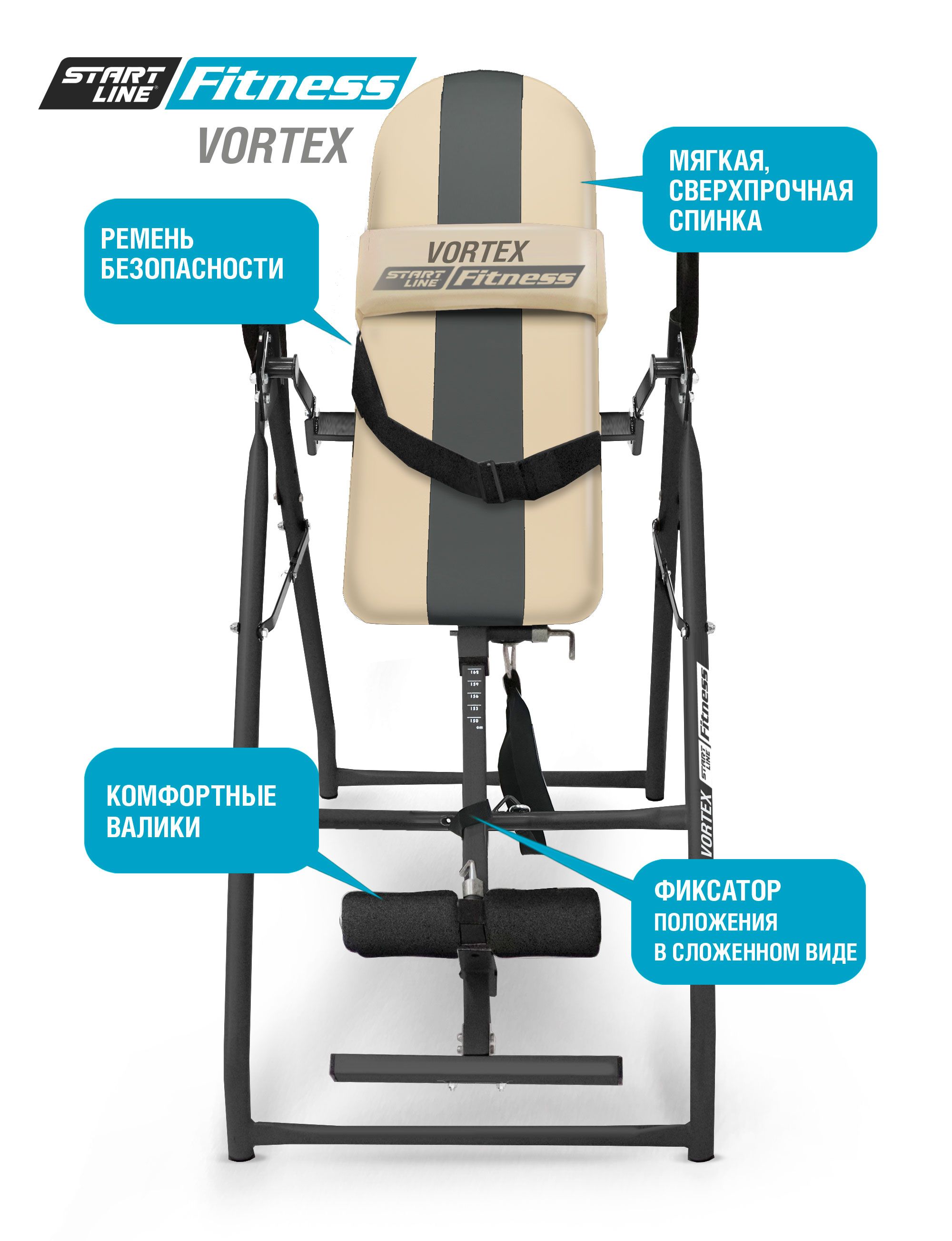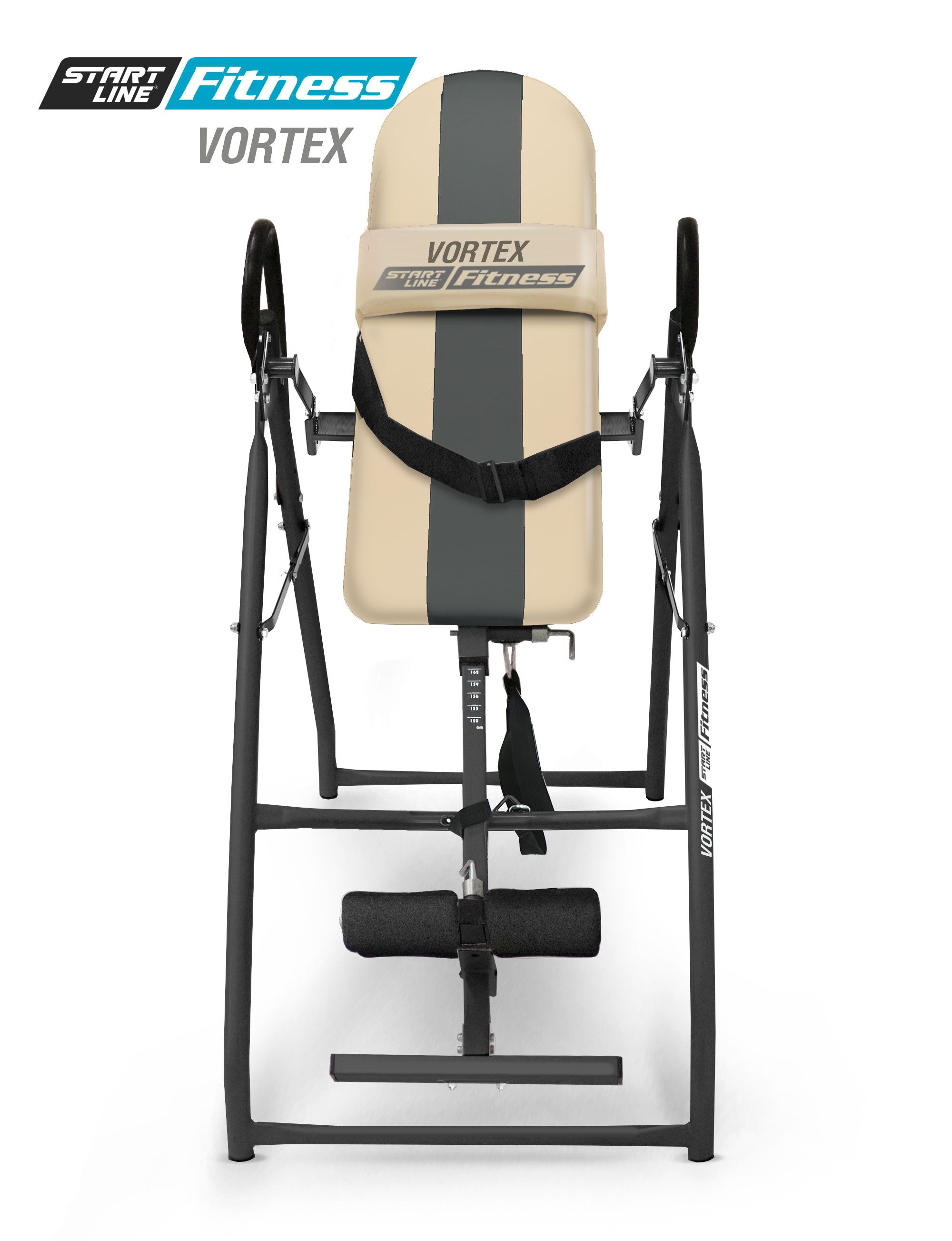 Инверсионный стол Vortex - новый ультрасовременный инверсионный тренажер от Start Line Fitness в стильном дизайне, который станет идеальным дополнением любого интерьера. Отличительной особенностью нового стола является наличие усиленной спинки, благодаря чему модель Vortex абсолютно безопасна в использовании. Стол с легкостью выдерживает нагрузку до 115 кг, при этом обладает небольшим весом. Инверсионный стол оснащен мягкой сверхпрочной спинкой для комфортной тренировки. Обивка спинки изготовлена из износостойкой и долговечной экокожи. Важным дополнением модели Vortex является удобная съемная подушка, которая позволяет правильно распределить и уменьшить нагрузку на мышцы спины. Инверсионный стол имеет складную конструкцию, которая позволяет убрать стол на хранение в одно движение, не занимая много места. Текстильная застежка фиксирует регулятор роста, что делает хранение еще более удобным и безопасным. Заниматься инверсионной терапией на столе Vortex могут как подростки, так и взрослые люди, ведь уровень роста новой модели изменяется от 150 до 197 см. Ограничение угла наклона осуществляется с помощью двух ремней, позволяющих выставить оптимальный угол для тренировки. При возврате в исходное положение энергоемкий амортизатор поглощает удар об опорную часть. Инверсионный стол Vortex оснащен надежной системой крепления ног. Механизм фиксируется одним движением, а мягкие валики исключают любые дискомфортные ощущения во время тренировки, надежно закрепляя голени в любом положении. Модель оборудована ремнем, позволяющим надежно зафиксировать положение тела, а также боковыми эргономичными ручками, которые обеспечивают безопасность и комфорт во время эксплуатации. Инверсионный стол Vortex - идеальное сочетание исключительной надежности конструкции, пользы от занятий, компактности и ультрасовременного дизайна.