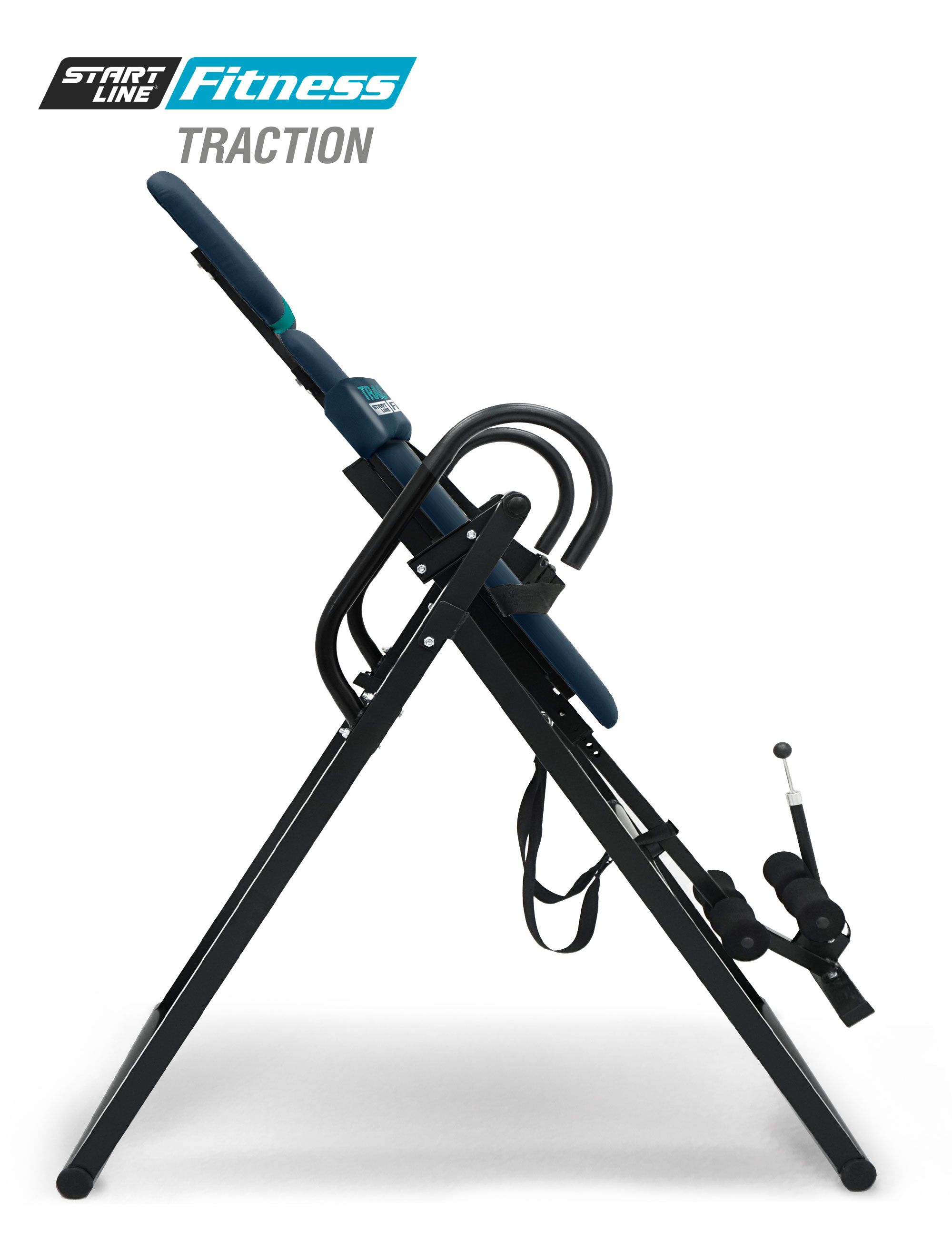 Инверсионный столnbsp;nbsp;Traction - новый ультрасовременный тренажер от Start Line Fitness в стильном дизайне, который станет идеальным дополнением любого интерьера. Стол максимально прост и удобен в сборке, так как рама инверсионного стола поставляется в сборе. Отличительной особенностью этого стола является наличие усиленной спинки, благодаря чему модель Traction абсолютно безопасна в использовании. Стол имеет прочную стальную конструкцию, поэтому может выдерживать максимальную нагрузку до 130 кг. Расширенные функциональные возможности этой модели дают эффективный способ облегчить боль в спине и улучшить осанку. Тренажер имеет складную конструкцию с системой фиксации в сложенном виде, что позволяет легко перемещать его с места на место и удобно хранить. Инверсионный стол оснащен мягкой сверхпрочной спинкой для комфортной тренировки. Обивка спинки изготовлена из износостойкой и долговечной экокожи.nbsp;nbsp;Важным дополнением модели Traction является удобная съемная подушка, которая позволяет правильно распределить и уменьшить нагрузку на мышцы спины. Заниматься инверсионной терапией на столе Traction могут как подростки, так и взрослые, ведь уровень роста регулируется от 150 до 197 см. Ограничение угла наклона осуществляется с помощью двух ремней, позволяющих выставить оптимальный угол для тренировки. При возврате в исходное положение энергоемкий амортизатор поглощает удар об опорную часть. Инверсионный стол Traction оснащен надежной системой крепления ног. Фиксация происходит в одно касание, а мягкие валики исключают любые дискомфортные ощущения во время тренировки, надежно закрепляя голени.nbsp;nbsp;Модель оборудована ремнем, позволяющим при необходимости надежно зафиксировать положение тела, а также боковыми эргономичными ручками, которые обеспечивают безопасность и комфорт во время эксплуатации. Инверсионный стол Traction - идеальное сочетание исключительной надежности и прочности конструкции, компактности и современного дизайна.