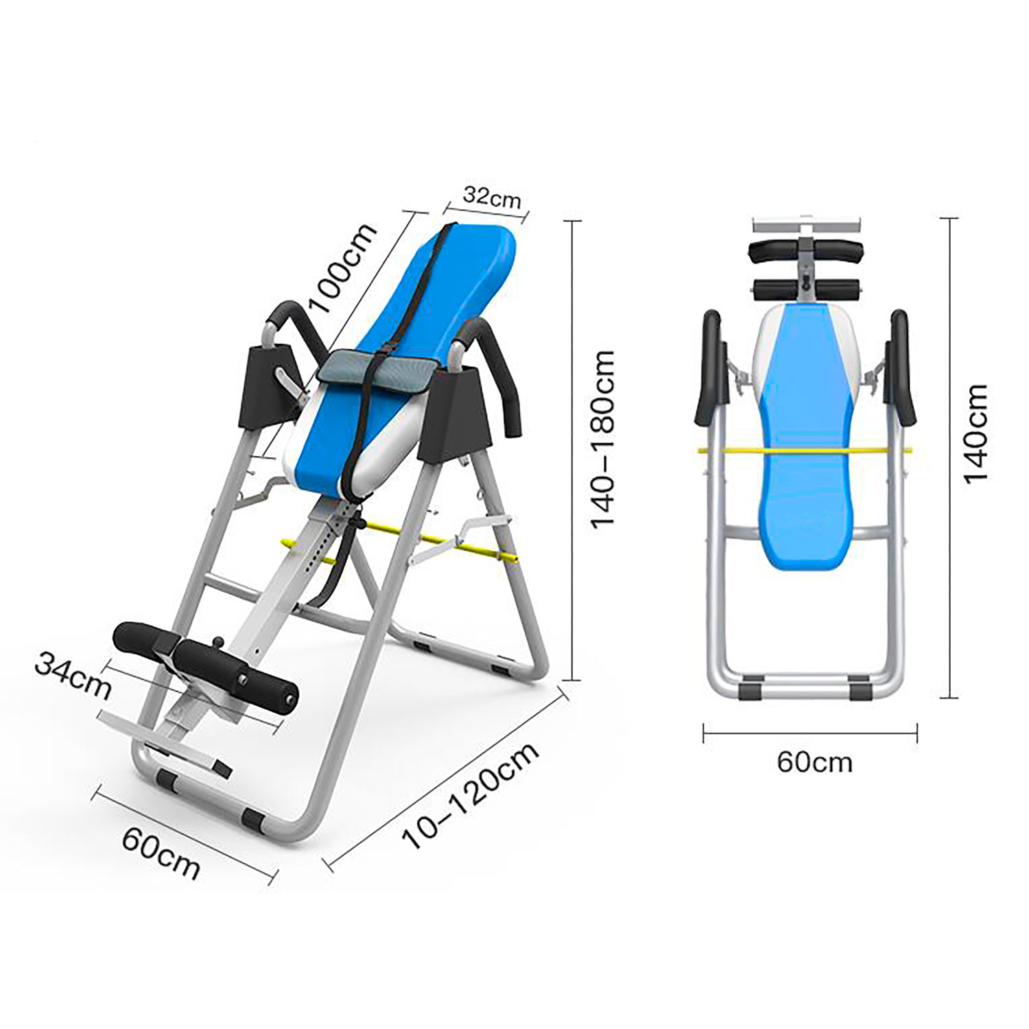 Инверсионный стол для домашнего применения с мягкой спинкой и фиксатором ног с помощью 4х валиков из поролона. На данной модели инверсионного стола предусмотрен выбор режима инверсии (с помощью стержня): легкий (угол до 22 гр), средний (угол от 22 до 55 гр), профессиональный (от 55 гр). Складная модель для хранения после занятий. Резиновые ножки. Рама изготовлена из стальной трубы Ø38 мм. Регулировка стола по высоте в 3 положениях (центр тяжести). Стол имеет различные виды регулировки для удобства использования: регулировка под рост пользователя (от 140 до 196 см) регулируемый фиксатор под голеностоп (фиксаторы из поролона) регулировка центра тяжести (3 положения) регулировка высоты с помощью ремня безопасности регулировка угла наклона (инверсии) с помощью стержня