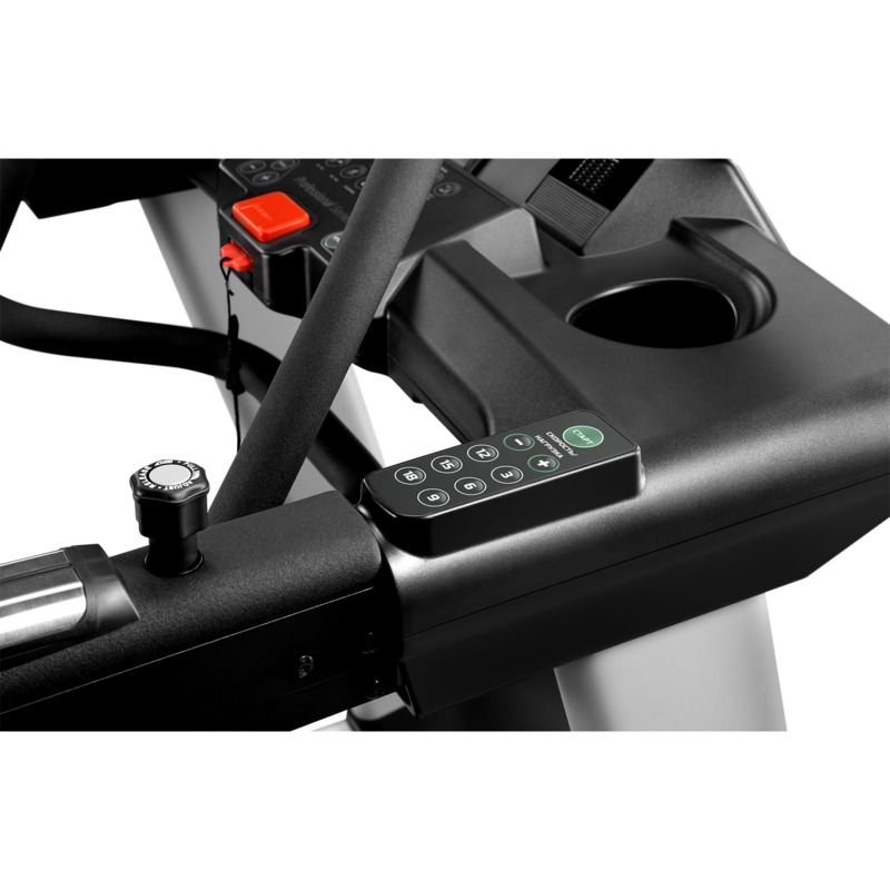 Пульт управления дорожкой состоит из двух панелей: панель управления беговой дорожкой и панель силового сопротивления. Пакет программ включает 12 силовых программ и 21 кардиотренировку — интервальные разной сложности, целевые программы для повышения выносливости, скорости и улучшения физической формы, пользовательские и т.д. Легкочитаемый LED дисплей состоит из 5 окон, отображает тип занятия (силовое или кардио), параметры и данные о тренировке: текущие скорость, пульс, дистанцию, темп, затраченную энергию в Вт и калориях, уровень нагрузки, рекомендованные верхнюю и нижнюю границы пульса согласно возрасту, выбранную программу, угол наклона.