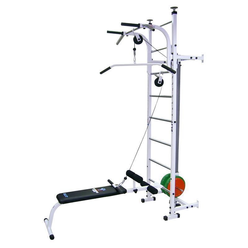 Навесной элемент используемый в комплексе со шведской стенкой «Элит». Приставка полностью совместима с лестницей «Элит». Устанавливается в штатные точки крепления к стене. Приставка оснащена направляющей рейкой, кареткой с накопителями для дисков с посадочным D=25 мм. Предельная нагрузка 130 кг. Приставка позволяет выполнять весь спектр тяг за голову и к животу. Высота верхней тяги регулируется изменением высоты турника. Положение скамейки горизонтальное. Приставка комплектуется двумя ручками: широкой и прямой узкой. Принцип работы приставки заключается в передаче нагрузки на мышцы по специальной траектории через систему тросов и блоков с отягощением. В качестве отягощения можно использовать тренировочные диски различных весов.