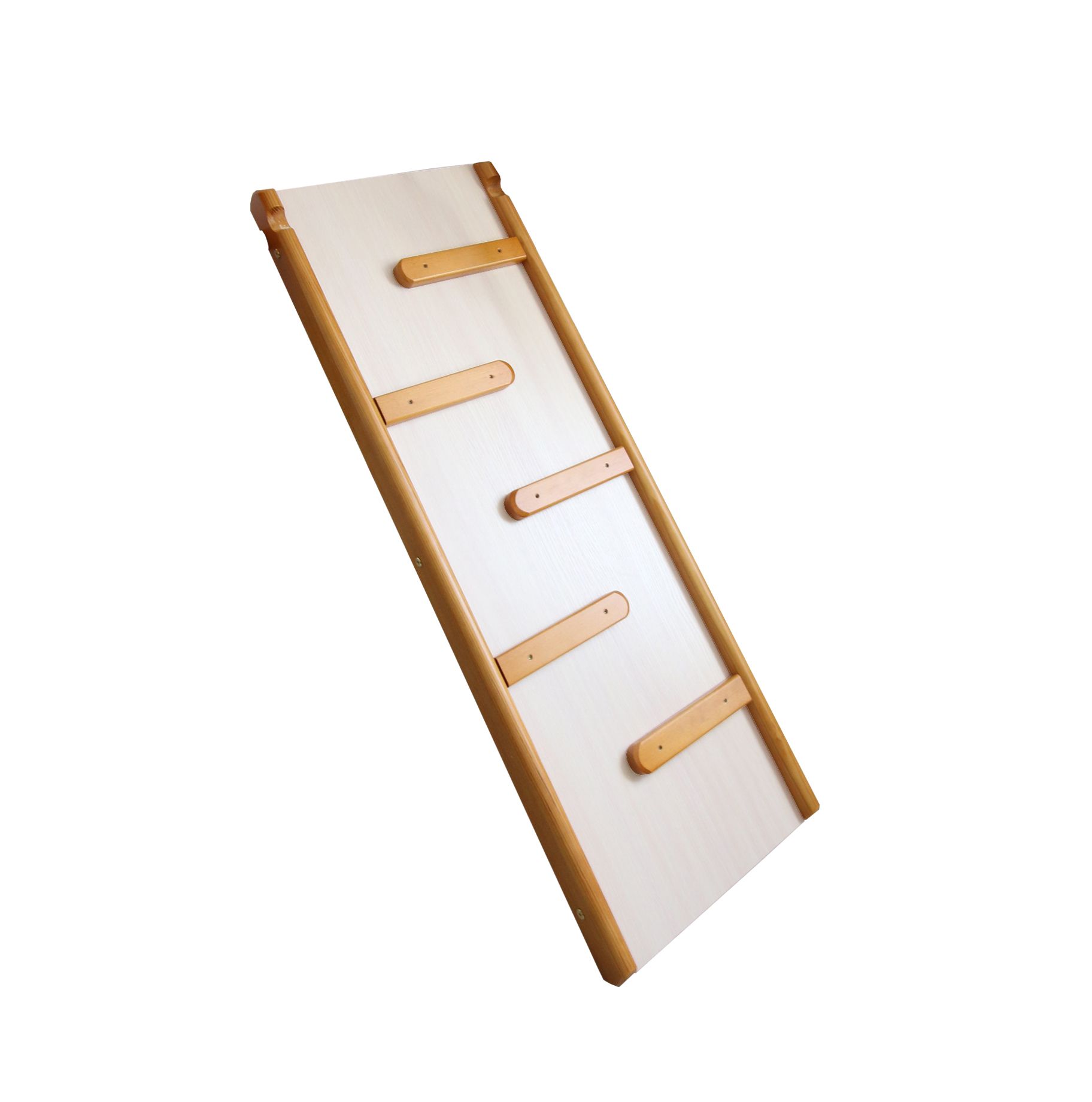 Универсальная модель с двумя сторонами имеет с одной стороный гладкую поверхность, а с другой несколько деревяных зацепов. Малышам очень нравится - лазить по скалолазу и скатываться с мини-горки. Скат-скалолаз подходит для детей в возрасте от 7 месяцев до 4 лет, устанавливается на ступени шведской стенки и выдерживает максимальную нагрузку до 50 кг.