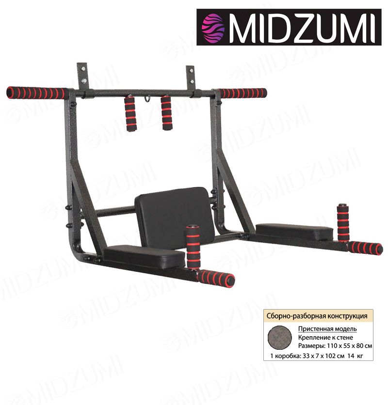 Торговый Дом Midzumi представляет новинку Турник Midzumi Ryota. Этот Турник показывает разнообразие модельного ряда продукции Midzumi. Прочная металлическая конструкция позволяет выдерживать до 200 кг. Крепление к стене на 4 кронштейна для подвеса. При выборе турника обратите внимание на материал Ваших стен. Они не должны быть выполнены из хрупких материалов, таких как гипсокартон и вагонка. Midzumi Ryota имеет мягкие неопреновые ручки, удобные широкие подлокотники и спинку, а также кольцо для подвеса мешков и груш.