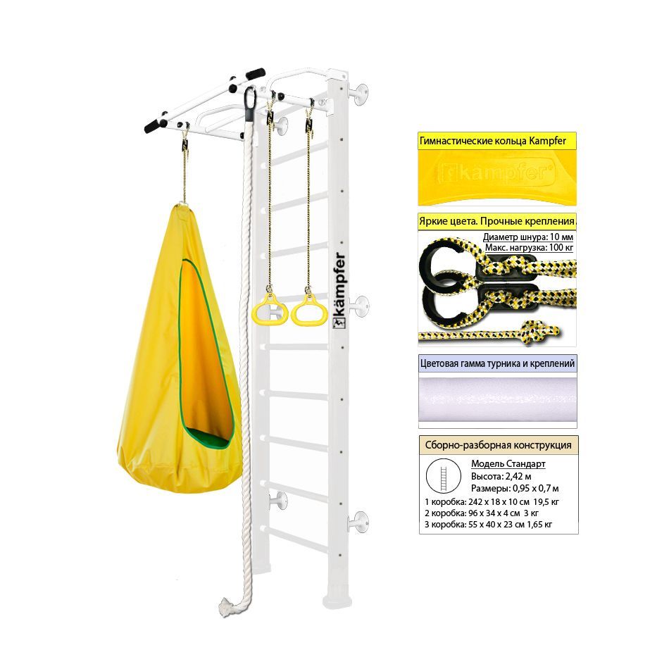 Пристенная шведская стенка Kampfer Shiny Wall включает в себя набор из самых популярных навесных аксессуаров: канат, гимнастические кольца, а также детские качели-кокон для игры и отдыха детей.