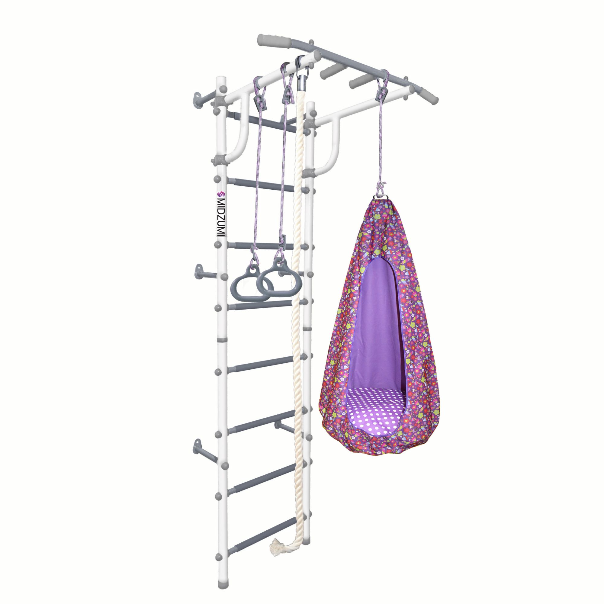 Детский спортивный комплекс Midzumi Hogo Kabe хорошо впишется в интерьер любой квартиры, так как он занимает мало места, 1-2 квадратных метра, компактный и его легко собрать. Модель многофункциональна благодаря популярному набору навесного оборудования: кольца, канат и качели-кокон.