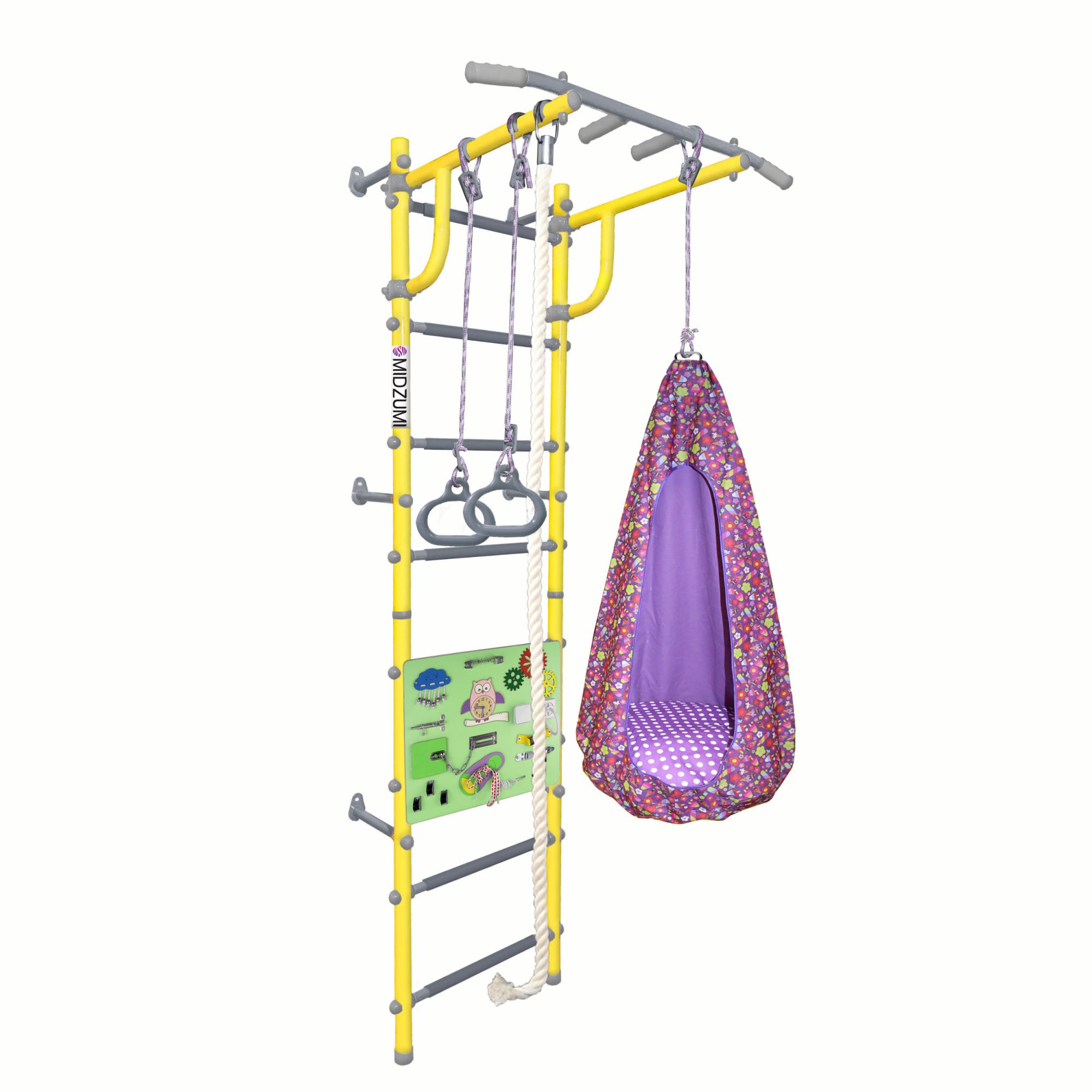 Комплектация: основа - металлическая шведская стенка с турником, гимнастические кольца, канат, качели-кокон, бизиборд.
