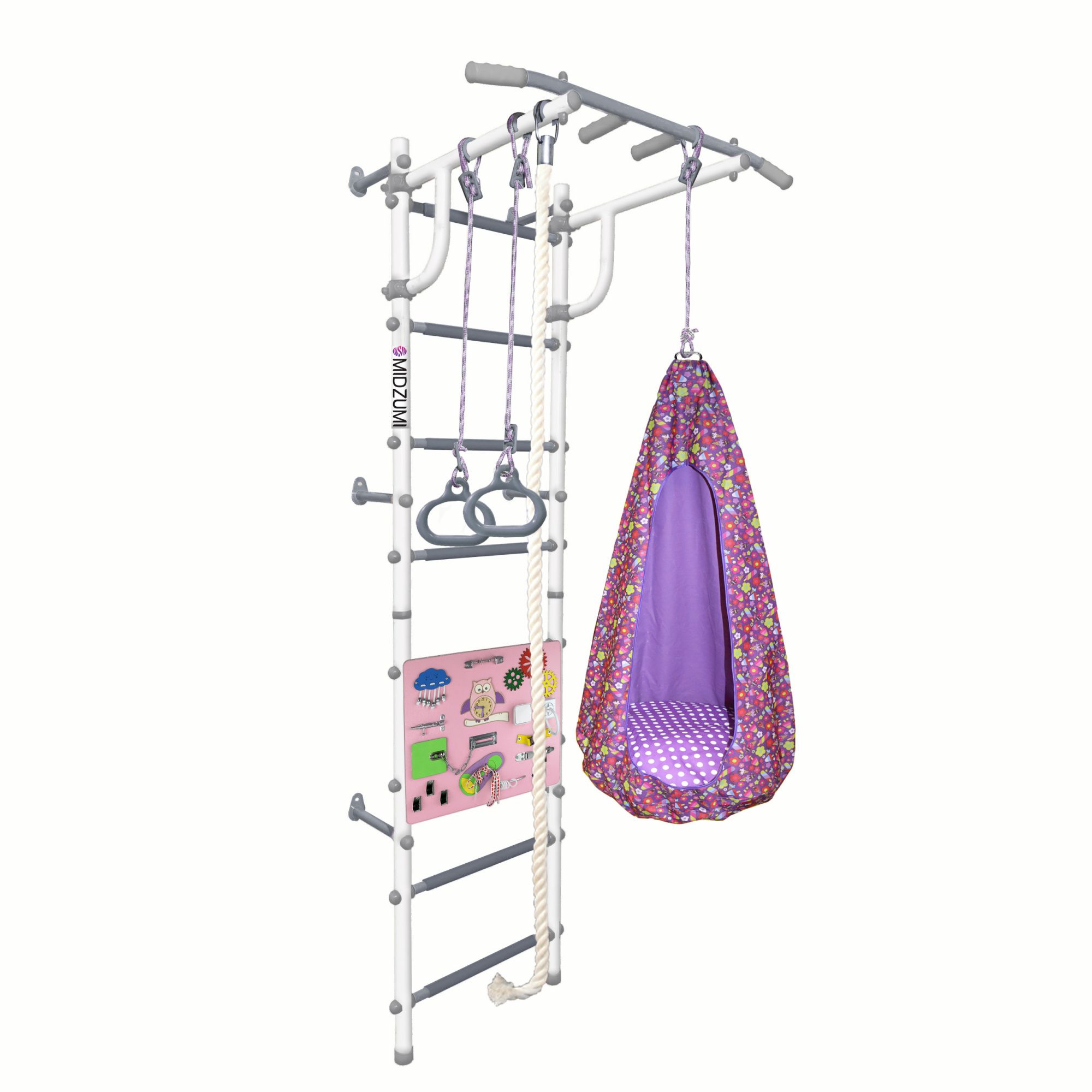 Комплектация: основа - металлическая шведская стенка с турником, гимнастические кольца, канат, качели-кокон, бизиборд.
