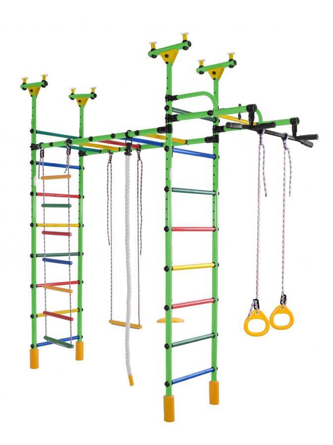 В этом комплексе к привычной металлической лестнице добавлена метал.лесенка из 8 перекладин и верхний лаз-рукоход, чтобы лазать на руках и играть под потолком.