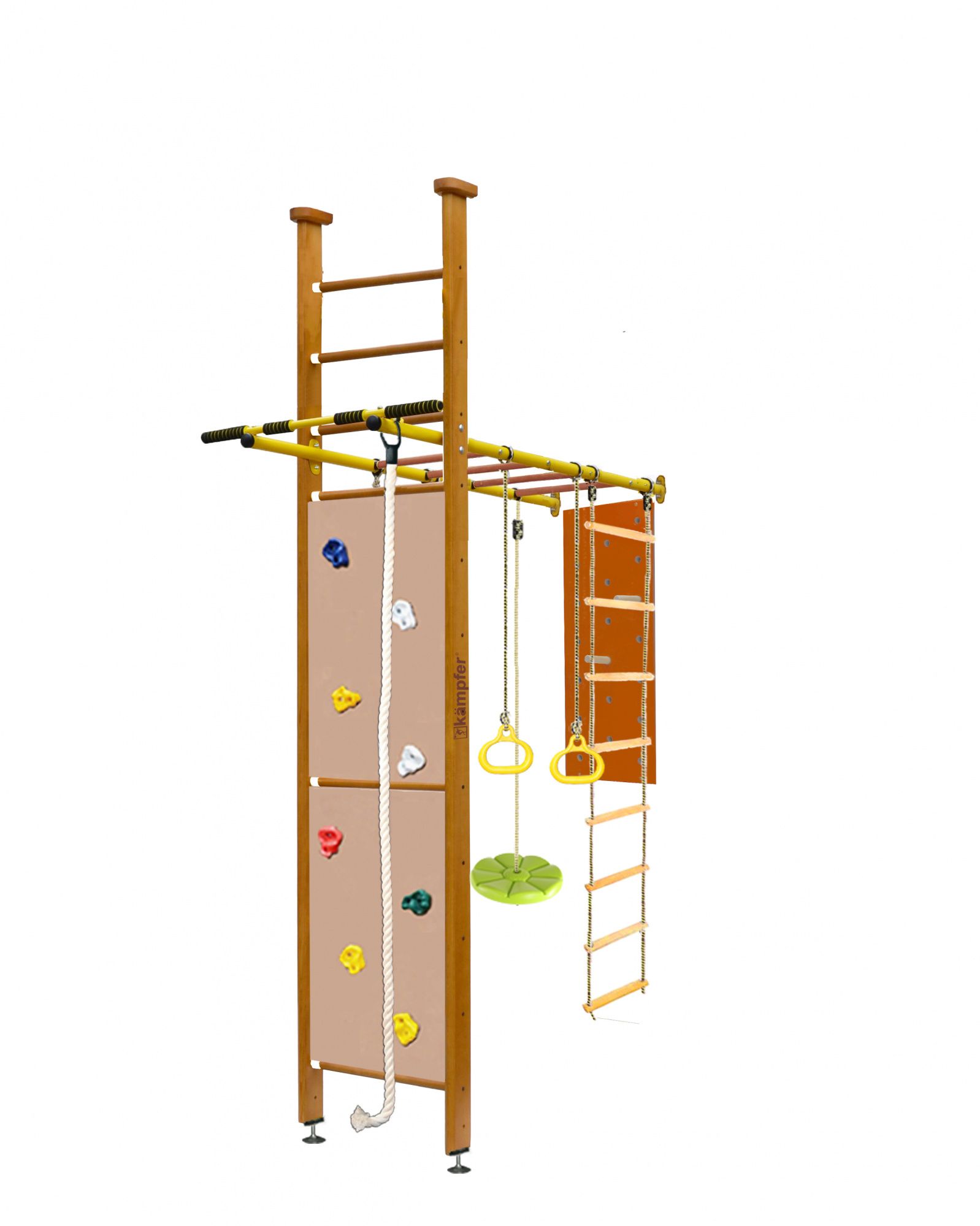 Домашний спортивно-игровой комплекс Kampfer Joy это новинка из линейки деревянных ДСК Kampfer в цветовой гамме на выбор, что позволяет подобрать нужный оттенок под дизайн помещения. Уникальная конструкция Kampfer Joy включает в себя скалолазную стенку на двух стойках, металлический турник с рукоходом и набор из самых популярных навесных аксессуаров канат, кольца, веревочную лестницу, пластикову лиану, а также новинку деревянный пегборд. Крепкий металлический турник выдерживает нагрузку до 120 кг, подходит как детям так и взрослым. Навесное оборудование Kampfer на прочных тросах выдерживает нагрузку до 100 кг. Допустимая нагрузка на скалолазную стенку, пегборд 50 кг. Особенностью спортивно-игрового комплекса Kampfer Joy является уникальная конструкция, совмещающая в себе и пристенное и распорное крепление, большой двойной скалолаз имеющий 8 пластиковых зацепов. Малышам очень нравится - лазить по скалолазу, забираться вверх по веревочной лестнице, перебираться по пегборду, висеть на канате и качаться на лиане - играя одновременно тренироваться выполняя все необходимые для физизического развития упражнения.