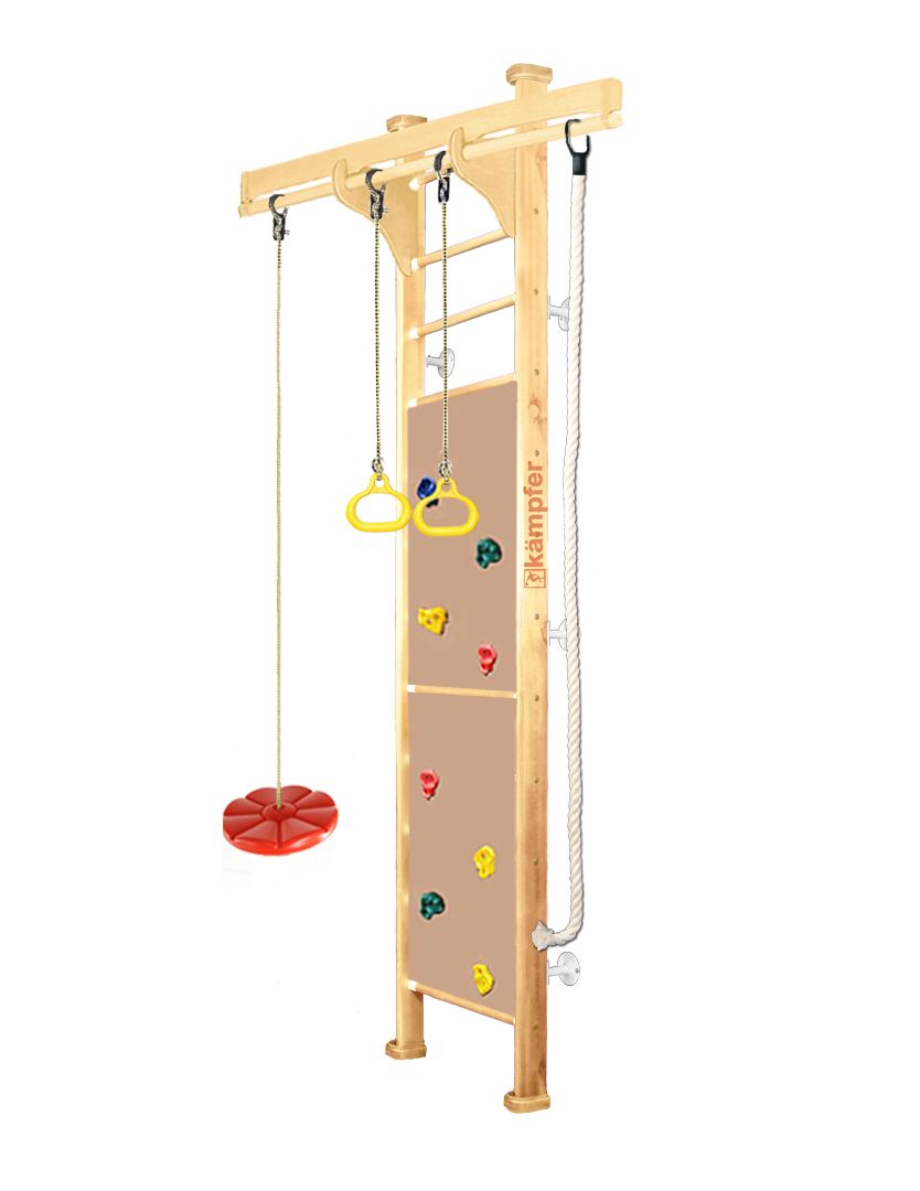 Домашний спортивно-игровой комплекс Kampfer Swift Wall это новинка на основе одной из самых популярных моделей из линейки деревянных ДСК Kampfer в цветовой гамме на выбор, что позволяет подобрать нужный оттенок под дизайн помещения. Модель Kampfer Swift включает в себя скалолазную стенку на двух стойках и перекладиной для навесного оборудования и набор из самых популярных навесных аксессуаров канат, кольца, а также лиану. Навесное оборудование Kampfer на прочных тросах выдерживает нагрузку до 100 кг. Особенностью Kampfer Swift является большой двойной скалолаз имеющий 8 пластиковых зацепов. Малышам очень нравится - лазить по скалолазной стенке развивая ловкость. Скалолазная стенка подходит для детей в возрасте от 4 лет и выдерживает максимальную нагрузку до 50 кг.