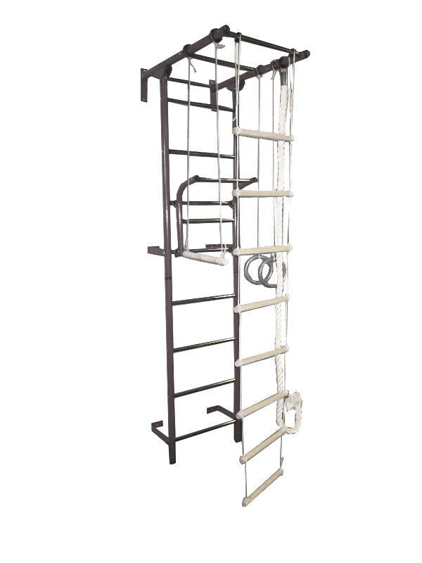 Комплектация: металлическая лестница, турник для узкого и широкого хвата с ПВХ покрытием, турник навесной, кольца гимнастические, лестница веревочная, трапеция, канат х/б, руководство по сборке.