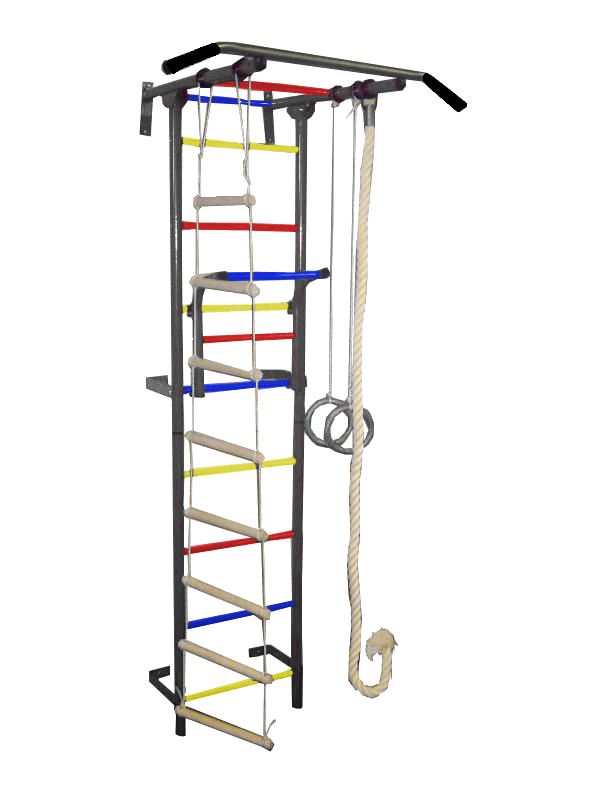 Комплектация: металлическая лестница, турник для узкого и широкого хвата с ПВХ покрытием, турник навесной, кольца гимнастические, лестница веревочная, трапеция, канат х/б, руководство по сборке.