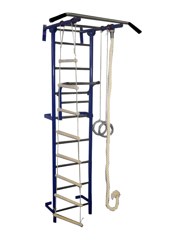 Комплектация: металлическая лестница, турник для узкого и широкого хвата с ПВХ покрытием, турник навесной, кольца гимнастические, лестница веревочная, трапеция, канат х/б, руководство по сборке.