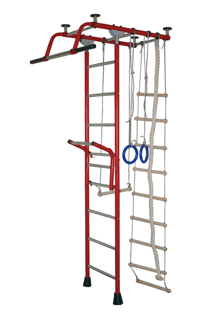 Комплектация: металлическая лестница, турник для узкого и широкого хвата с ПВХ покрытием, турник навесной, кольца гимнастические, лестница веревочная, трапеция, канат х/б, руководство по сборке.