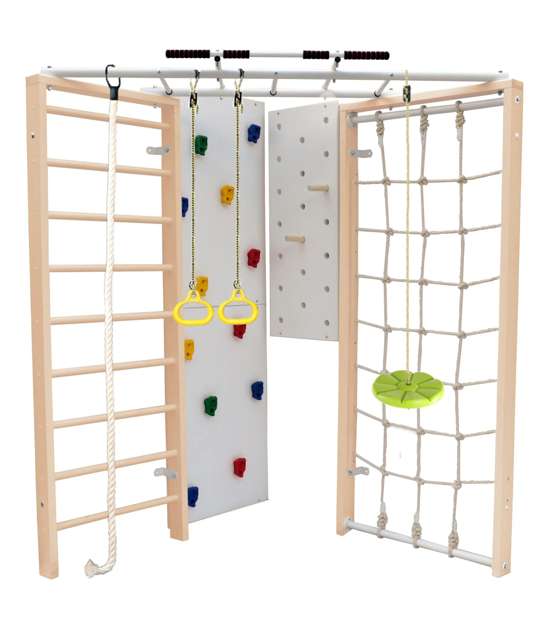 Модель Kampfer Fantastic включает в себя самый обширный набор аксессуаров - турник, шведскую стенку, канатный лаз, скалодром, пегборд, и самые популярное навесное оборудование канат, кольца и лиану. Крепкий металлический турник выдерживает нагрузку до 120 кг, подходит как детям так и взрослым. Навесное оборудование Kampfer на прочных тросах выдерживает нагрузку до 100 кг. Допустимая нагрузка на скалолаз, пегборд, канатный лаз и навесное оборудование 50 кг. Особенностью пристенной шведской стенки Kampfer Fantastic является угловая конструкция, большой двойной скалолаз имеющий 12 пластиковых зацепов. Малышам очень нравится - лазить по скалолазу, забираться вверх по сетке канатного лаза, перебираться по пегборду, висеть на канате и качаться на лиане.