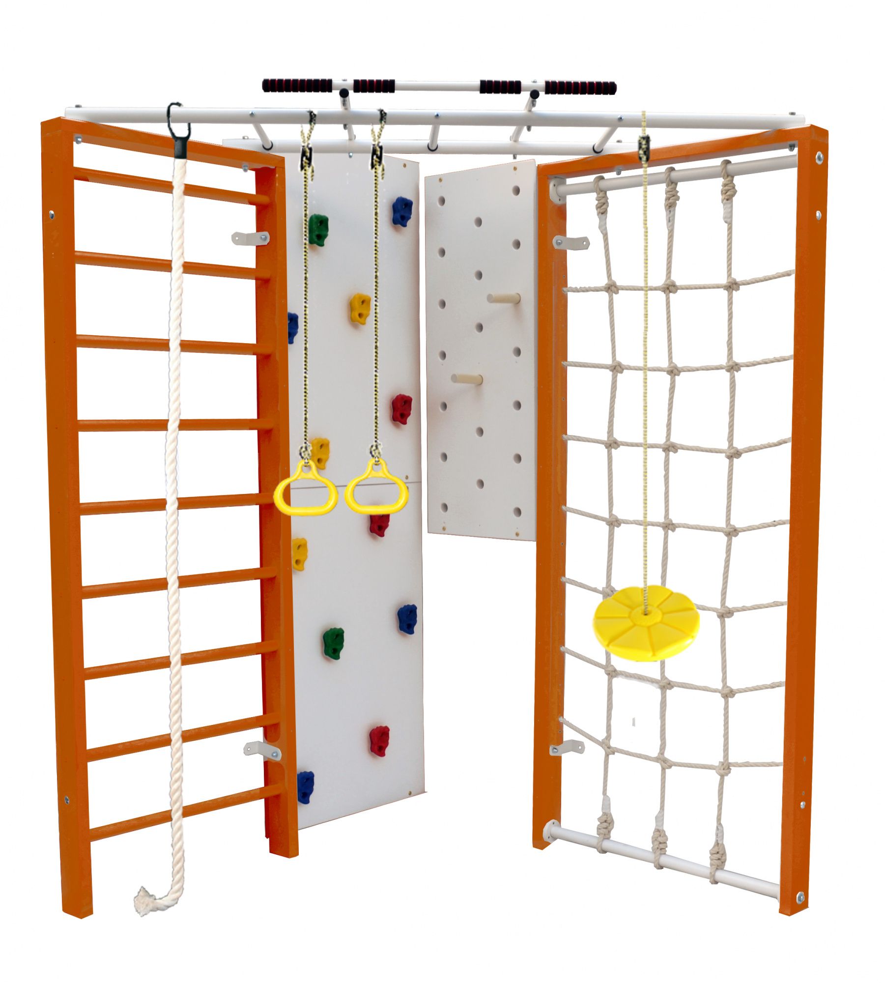 Модель Kampfer Fantastic включает в себя самый обширный набор аксессуаров - турник, шведскую стенку, канатный лаз, скалодром, пегборд, и самые популярное навесное оборудование канат, кольца и лиану. Крепкий металлический турник выдерживает нагрузку до 120 кг, подходит как детям так и взрослым. Навесное оборудование Kampfer на прочных тросах выдерживает нагрузку до 100 кг. Допустимая нагрузка на скалолаз, пегборд, канатный лаз и навесное оборудование 50 кг. Особенностью пристенной шведской стенки Kampfer Fantastic является угловая конструкция, большой двойной скалолаз имеющий 12 пластиковых зацепов. Малышам очень нравится - лазить по скалолазу, забираться вверх по сетке канатного лаза, перебираться по пегборду, висеть на канате и качаться на лиане.