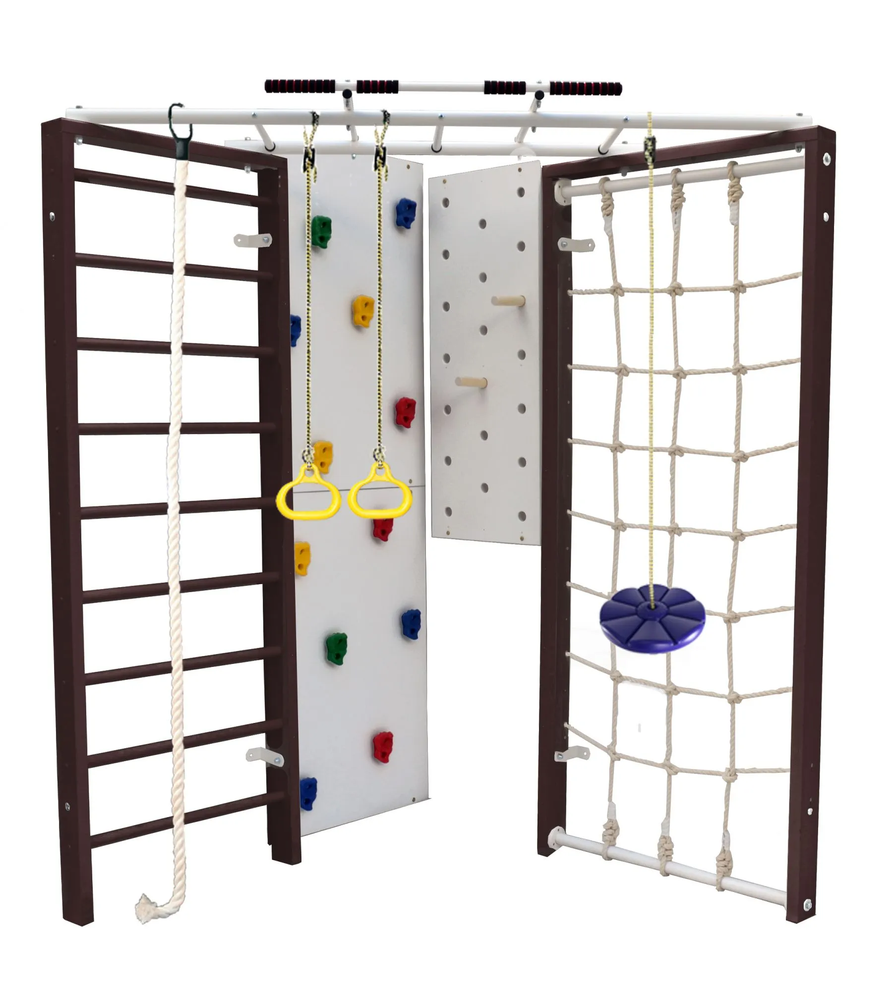 Модель Kampfer Fantastic включает в себя самый обширный набор аксессуаров - турник, шведскую стенку, канатный лаз, скалодром, пегборд, и самые популярное навесное оборудование канат, кольца и лиану. Крепкий металлический турник выдерживает нагрузку до 120 кг, подходит как детям так и взрослым. Навесное оборудование Kampfer на прочных тросах выдерживает нагрузку до 100 кг. Допустимая нагрузка на скалолаз, пегборд, канатный лаз и навесное оборудование 50 кг. Особенностью пристенной шведской стенки Kampfer Fantastic является угловая конструкция, большой двойной скалолаз имеющий 12 пластиковых зацепов. Малышам очень нравится - лазить по скалолазу, забираться вверх по сетке канатного лаза, перебираться по пегборду, висеть на канате и качаться на лиане.