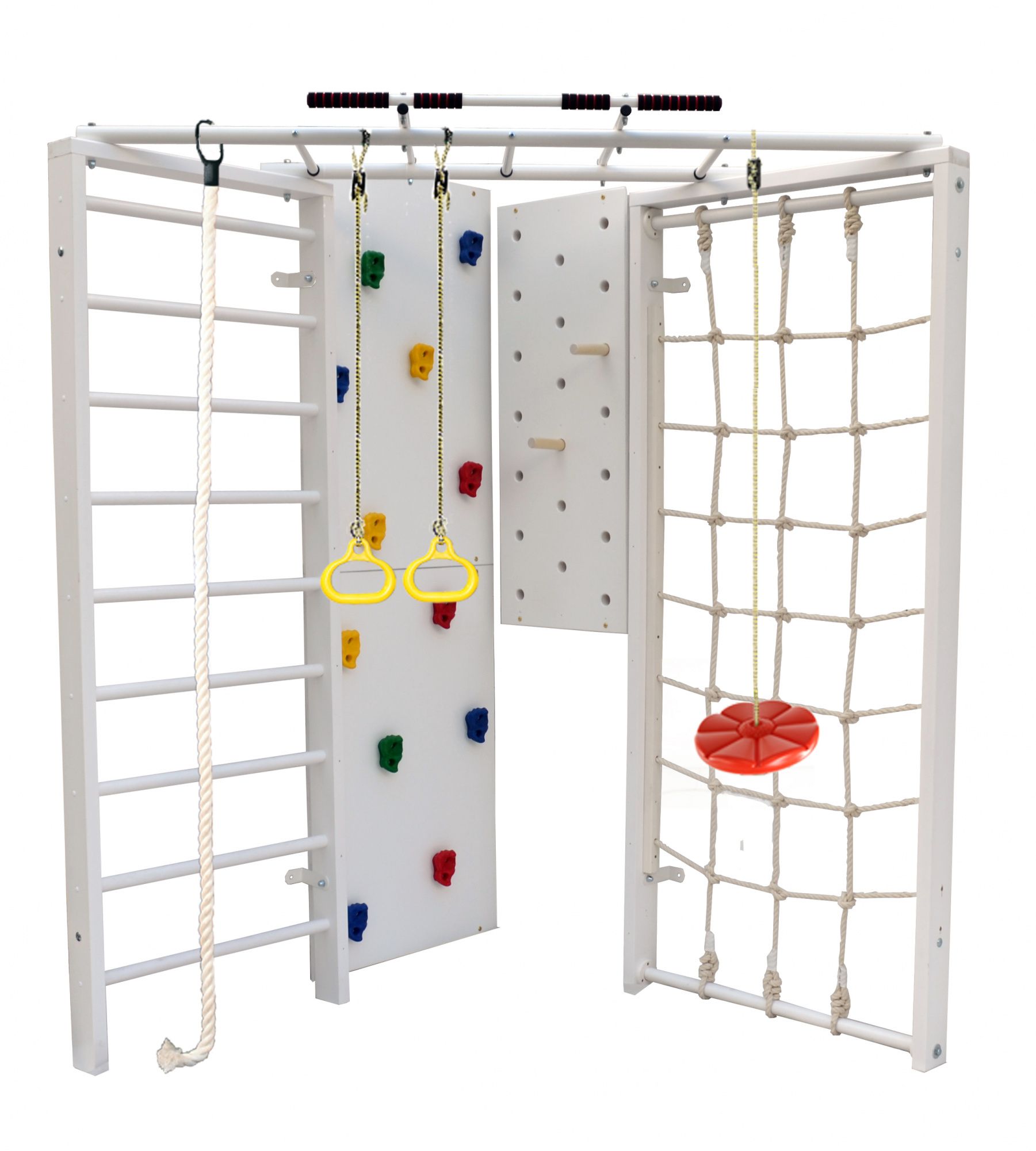 Модель Kampfer Fantastic включает в себя самый обширный набор аксессуаров - турник, шведскую стенку, канатный лаз, скалодром, пегборд, и самые популярное навесное оборудование канат, кольца и лиану. Крепкий металлический турник выдерживает нагрузку до 120 кг, подходит как детям так и взрослым. Навесное оборудование Kampfer на прочных тросах выдерживает нагрузку до 100 кг. Допустимая нагрузка на скалолаз, пегборд, канатный лаз и навесное оборудование 50 кг. Особенностью пристенной шведской стенки Kampfer Fantastic является угловая конструкция, большой двойной скалолаз имеющий 12 пластиковых зацепов. Малышам очень нравится - лазить по скалолазу, забираться вверх по сетке канатного лаза, перебираться по пегборду, висеть на канате и качаться на лиане.