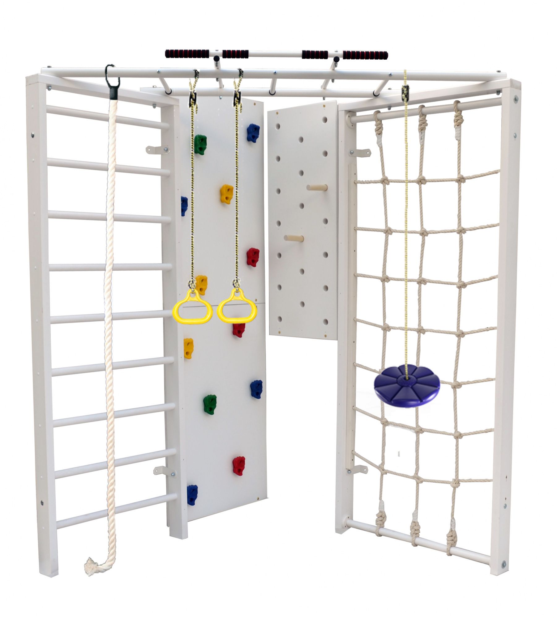 Модель Kampfer Fantastic включает в себя самый обширный набор аксессуаров - турник, шведскую стенку, канатный лаз, скалодром, пегборд, и самые популярное навесное оборудование канат, кольца и лиану. Крепкий металлический турник выдерживает нагрузку до 120 кг, подходит как детям так и взрослым. Навесное оборудование Kampfer на прочных тросах выдерживает нагрузку до 100 кг. Допустимая нагрузка на скалолаз, пегборд, канатный лаз и навесное оборудование 50 кг. Особенностью пристенной шведской стенки Kampfer Fantastic является угловая конструкция, большой двойной скалолаз имеющий 12 пластиковых зацепов. Малышам очень нравится - лазить по скалолазу, забираться вверх по сетке канатного лаза, перебираться по пегборду, висеть на канате и качаться на лиане.