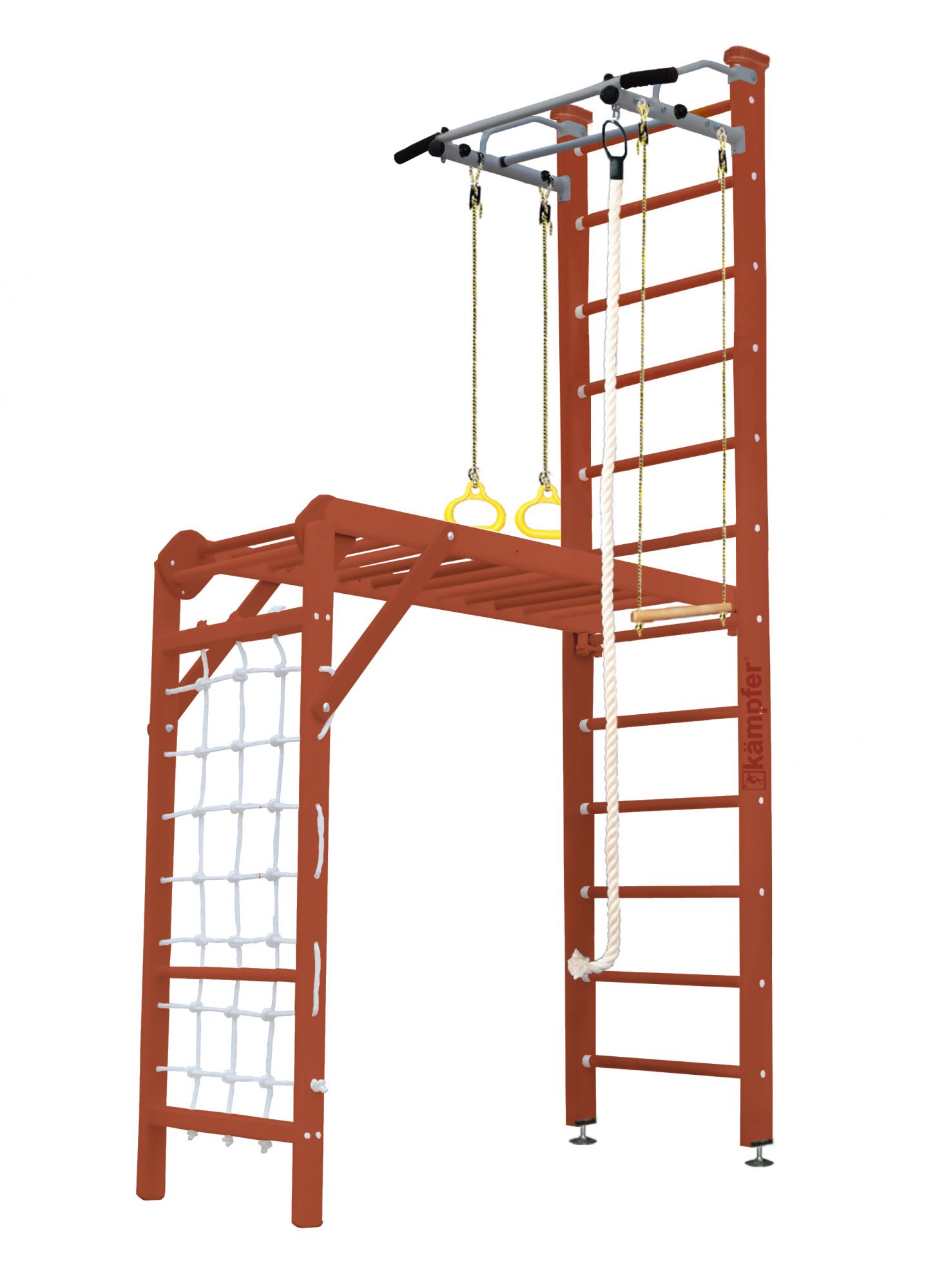 Домашний спортивный комплекс Kampfer Union Ceiling это новинка на основе одной из самых популярных моделей из линейки деревянных ДСК Kampfer в цветовой гамме на выбор, что позволяет подобрать нужный оттенок под дизайн помещения. Модель Kampfer Union Ceiling включает в себя классическую шведскую стенку, металлический турник и набор из самых популярных навесных аксессуаров канат, кольца, трапецию, а также новинку уголок сетку-рукоход. Крепкий металлический турник выдерживает нагрузку до 120 кг, подходит как детям так и взрослым. Навесное оборудование Kampfer на прочных тросах выдерживает нагрузку до 100 кг. Особенностью шведской стенки Kampfer Union является уголок сетка-рукоход имеющий с одной стороный веревочную сетку, а с другой деревянную лестницу. Малышам очень нравится - лазить по веревочной сетке и лесенке. Уголок сетка-рукоход предназначен для раннего развития детей в возрасте от 7 месяцев до 4 лет, устанавливается на ступени шведской стенки и выдерживает максимальную нагрузку до 50 кг. Уголок сетку-рукоход также можно установить отдельно на пол и использовать рукоход как лестницу.