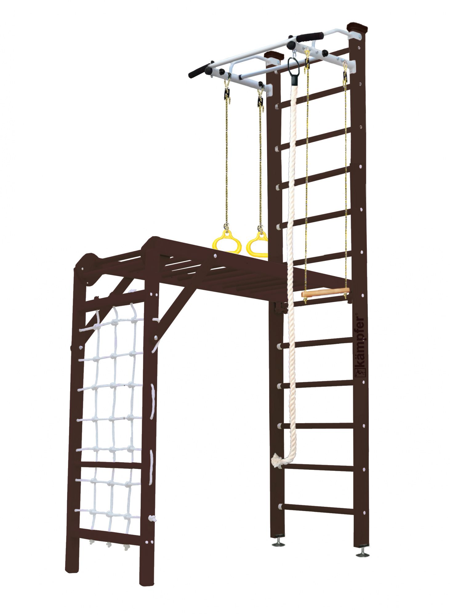 Домашний спортивный комплекс Kampfer Union Ceiling это новинка на основе одной из самых популярных моделей из линейки деревянных ДСК Kampfer в цветовой гамме на выбор, что позволяет подобрать нужный оттенок под дизайн помещения. Модель Kampfer Union Ceiling включает в себя классическую шведскую стенку, металлический турник и набор из самых популярных навесных аксессуаров канат, кольца, трапецию, а также новинку уголок сетку-рукоход. Крепкий металлический турник выдерживает нагрузку до 120 кг, подходит как детям так и взрослым. Навесное оборудование Kampfer на прочных тросах выдерживает нагрузку до 100 кг. Особенностью шведской стенки Kampfer Union является уголок сетка-рукоход имеющий с одной стороный веревочную сетку, а с другой деревянную лестницу. Малышам очень нравится - лазить по веревочной сетке и лесенке. Уголок сетка-рукоход предназначен для раннего развития детей в возрасте от 7 месяцев до 4 лет, устанавливается на ступени шведской стенки и выдерживает максимальную нагрузку до 50 кг. Уголок сетку-рукоход также можно установить отдельно на пол и использовать рукоход как лестницу.