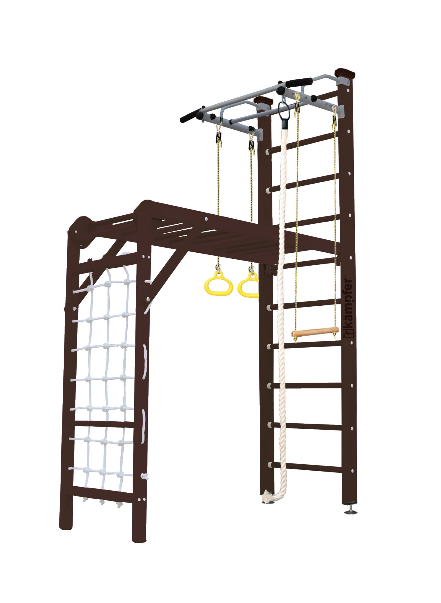Домашний спортивный комплекс Kampfer Union Ceiling это новинка на основе одной из самых популярных моделей из линейки деревянных ДСК Kampfer в цветовой гамме на выбор, что позволяет подобрать нужный оттенок под дизайн помещения. Модель Kampfer Union Ceiling включает в себя классическую шведскую стенку, металлический турник и набор из самых популярных навесных аксессуаров канат, кольца, трапецию, а также новинку уголок сетку-рукоход. Крепкий металлический турник выдерживает нагрузку до 120 кг, подходит как детям так и взрослым. Навесное оборудование Kampfer на прочных тросах выдерживает нагрузку до 100 кг. Особенностью шведской стенки Kampfer Union является уголок сетка-рукоход имеющий с одной стороный веревочную сетку, а с другой деревянную лестницу. Малышам очень нравится - лазить по веревочной сетке и лесенке. Уголок сетка-рукоход предназначен для раннего развития детей в возрасте от 7 месяцев до 4 лет, устанавливается на ступени шведской стенки и выдерживает максимальную нагрузку до 50 кг. Уголок сетку-рукоход также можно установить отдельно на пол и использовать рукоход как лестницу.