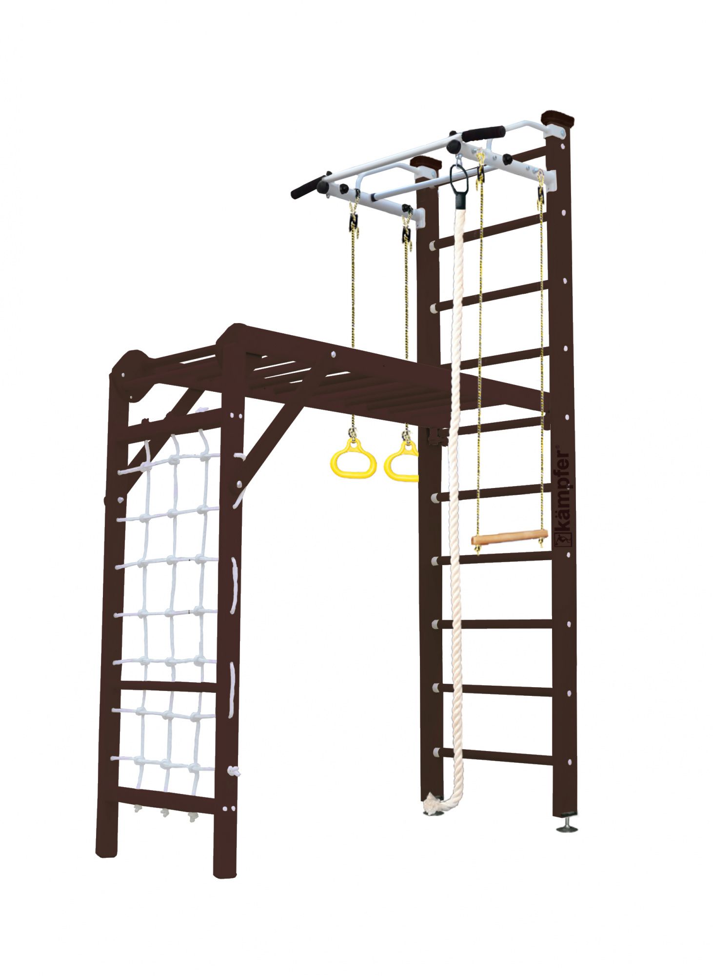 Домашний спортивный комплекс Kampfer Union Ceiling это новинка на основе одной из самых популярных моделей из линейки деревянных ДСК Kampfer в цветовой гамме на выбор, что позволяет подобрать нужный оттенок под дизайн помещения. Модель Kampfer Union Ceiling включает в себя классическую шведскую стенку, металлический турник и набор из самых популярных навесных аксессуаров канат, кольца, трапецию, а также новинку уголок сетку-рукоход. Крепкий металлический турник выдерживает нагрузку до 120 кг, подходит как детям так и взрослым. Навесное оборудование Kampfer на прочных тросах выдерживает нагрузку до 100 кг. Особенностью шведской стенки Kampfer Union является уголок сетка-рукоход имеющий с одной стороный веревочную сетку, а с другой деревянную лестницу. Малышам очень нравится - лазить по веревочной сетке и лесенке. Уголок сетка-рукоход предназначен для раннего развития детей в возрасте от 7 месяцев до 4 лет, устанавливается на ступени шведской стенки и выдерживает максимальную нагрузку до 50 кг. Уголок сетку-рукоход также можно установить отдельно на пол и использовать рукоход как лестницу.