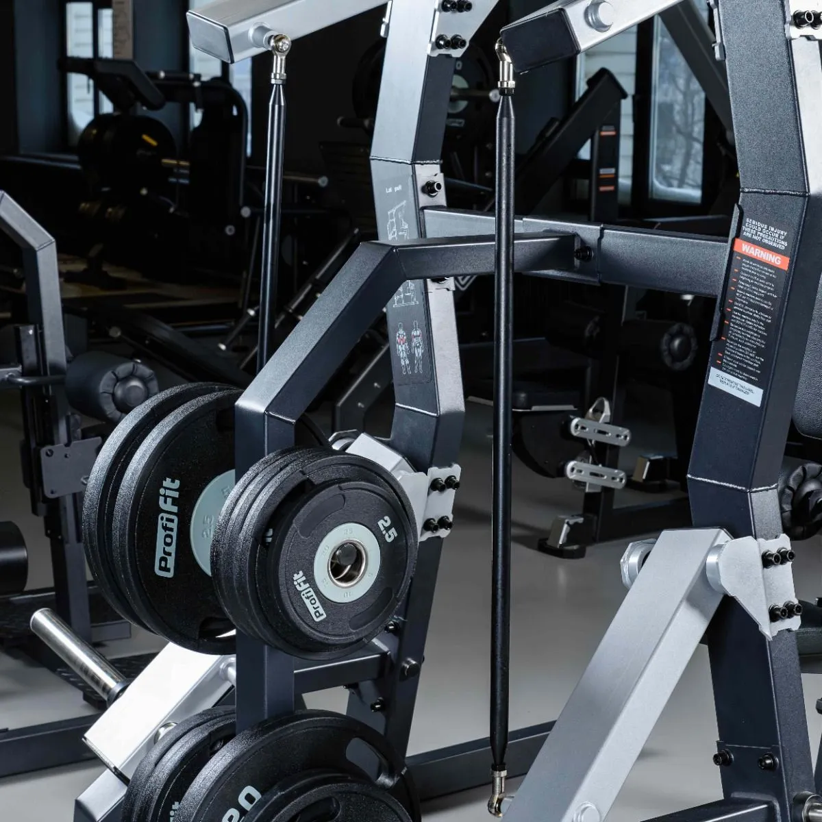 Накопители для хранения и работы со свободными весами оборудованы кольцами из плотной резины для предотвращения соприкосновения дисков с рамой тренажера.