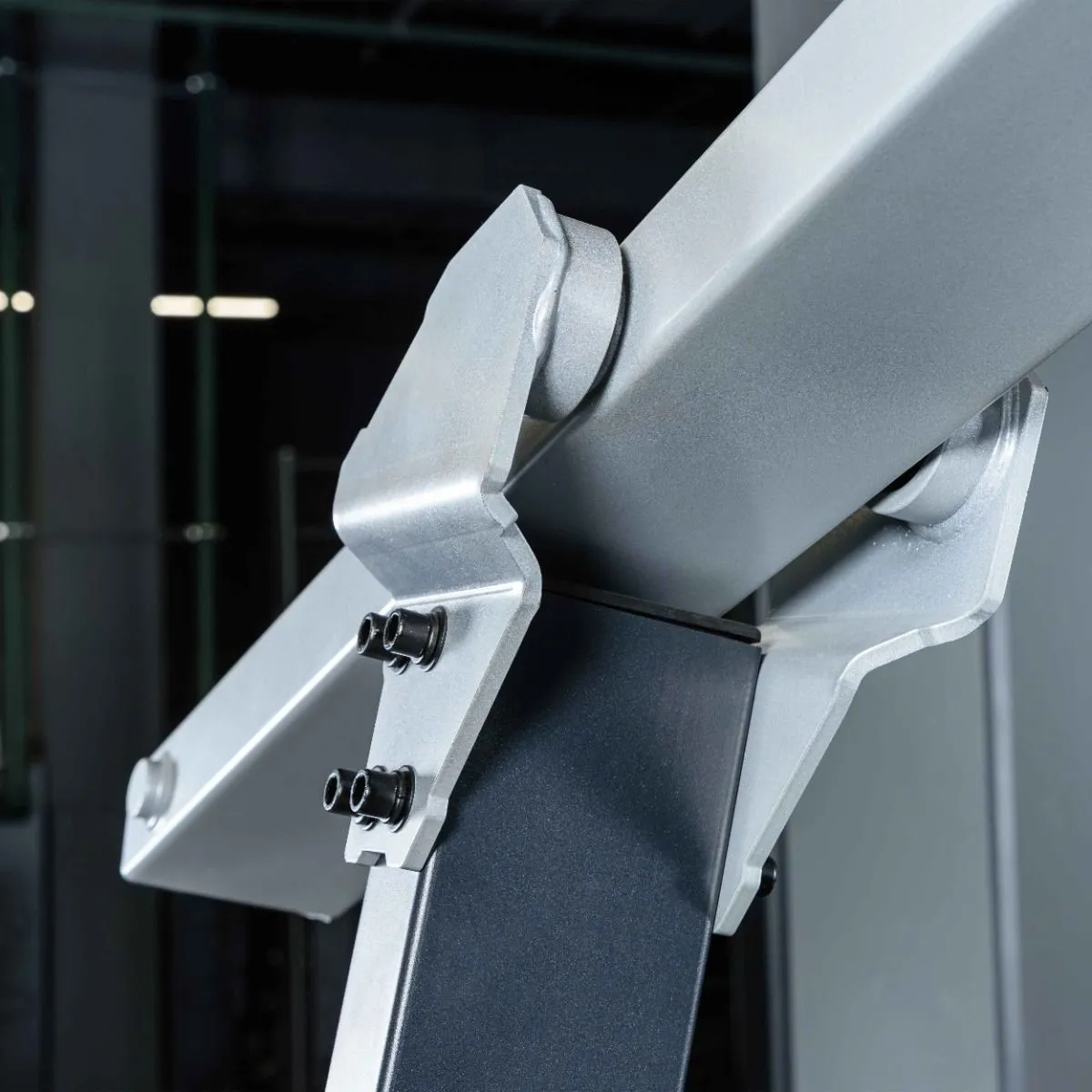 На раме тренажера установлено шесть хромированных накопителей из толстостенной стальной трубы для хранения свободных весов и два на подвижных рычагах.