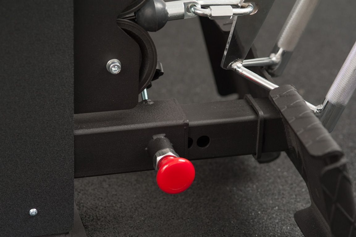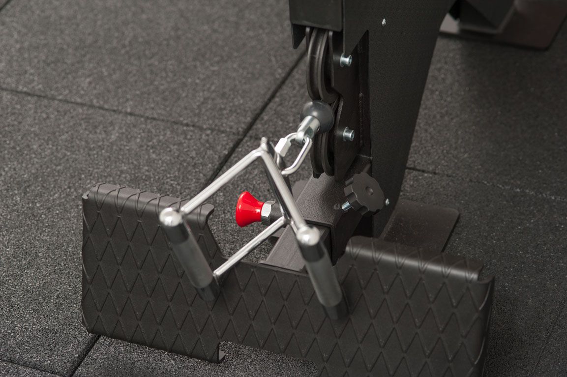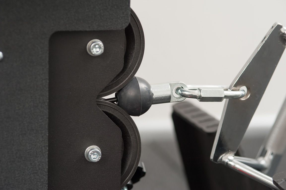 4) Упор для ступней горизонтальной тяги имеет 7 рабочих положений для регулировки длины вылета и дополнительно прижимается винтовым барашком, чтобы исключить неприятный люфт во время выполнения упражнения.