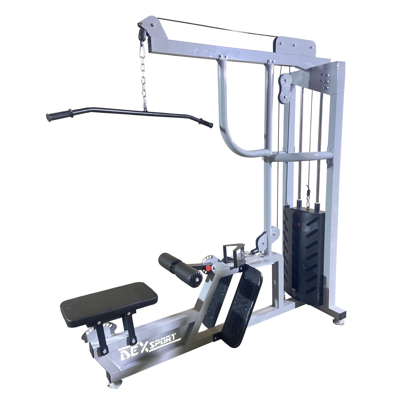 Нижняя тяга выполняется сидя на специальном регулируемом сидении с упором для ног. Такая конструкция тренажера вертикально-горизонтальная тяга позволяет работать с максимальной амплитудой, прорабатывая все пучки широчайших мышц спины.