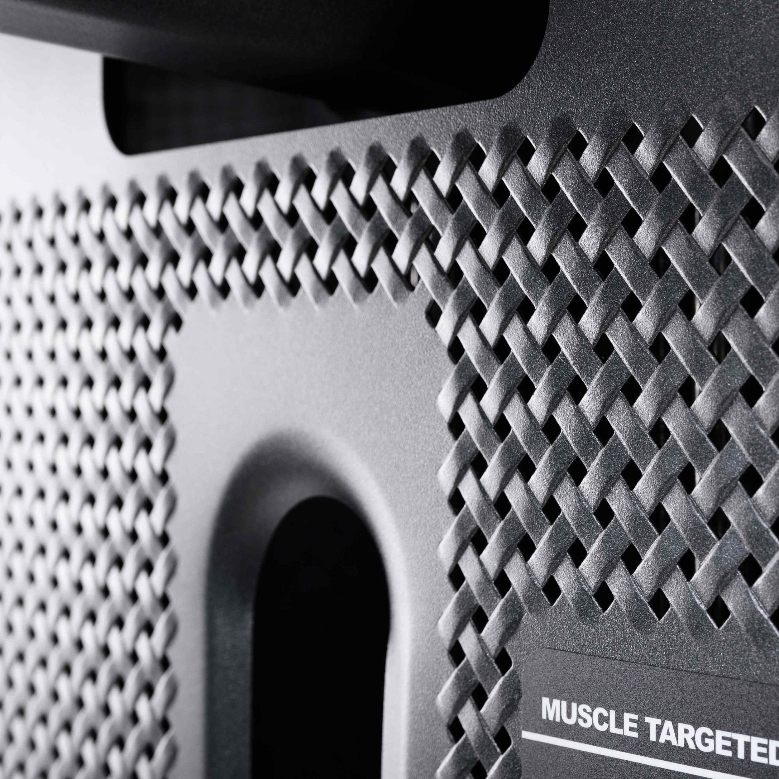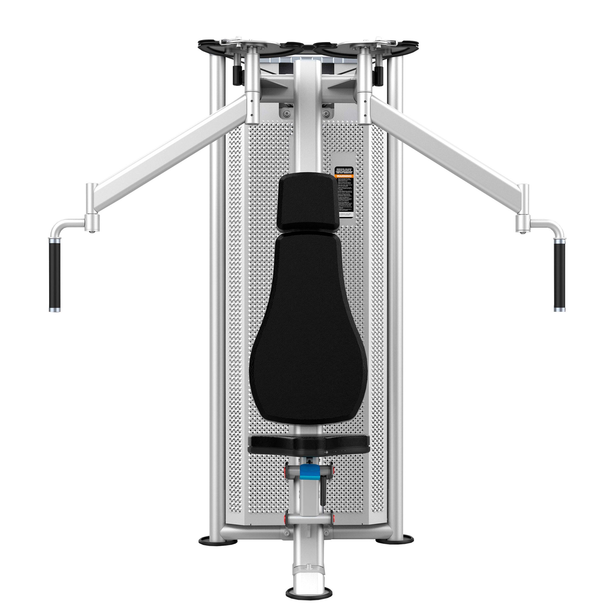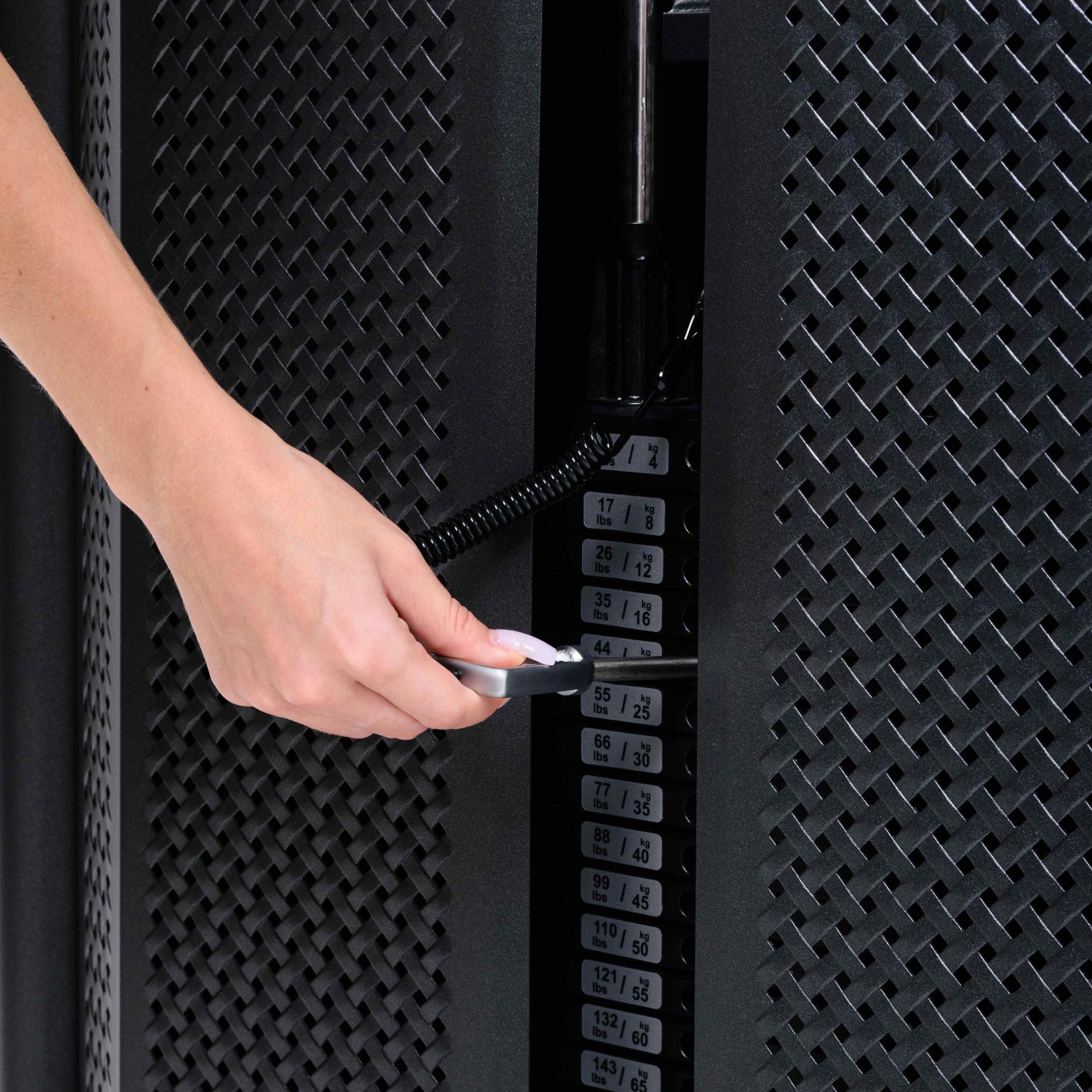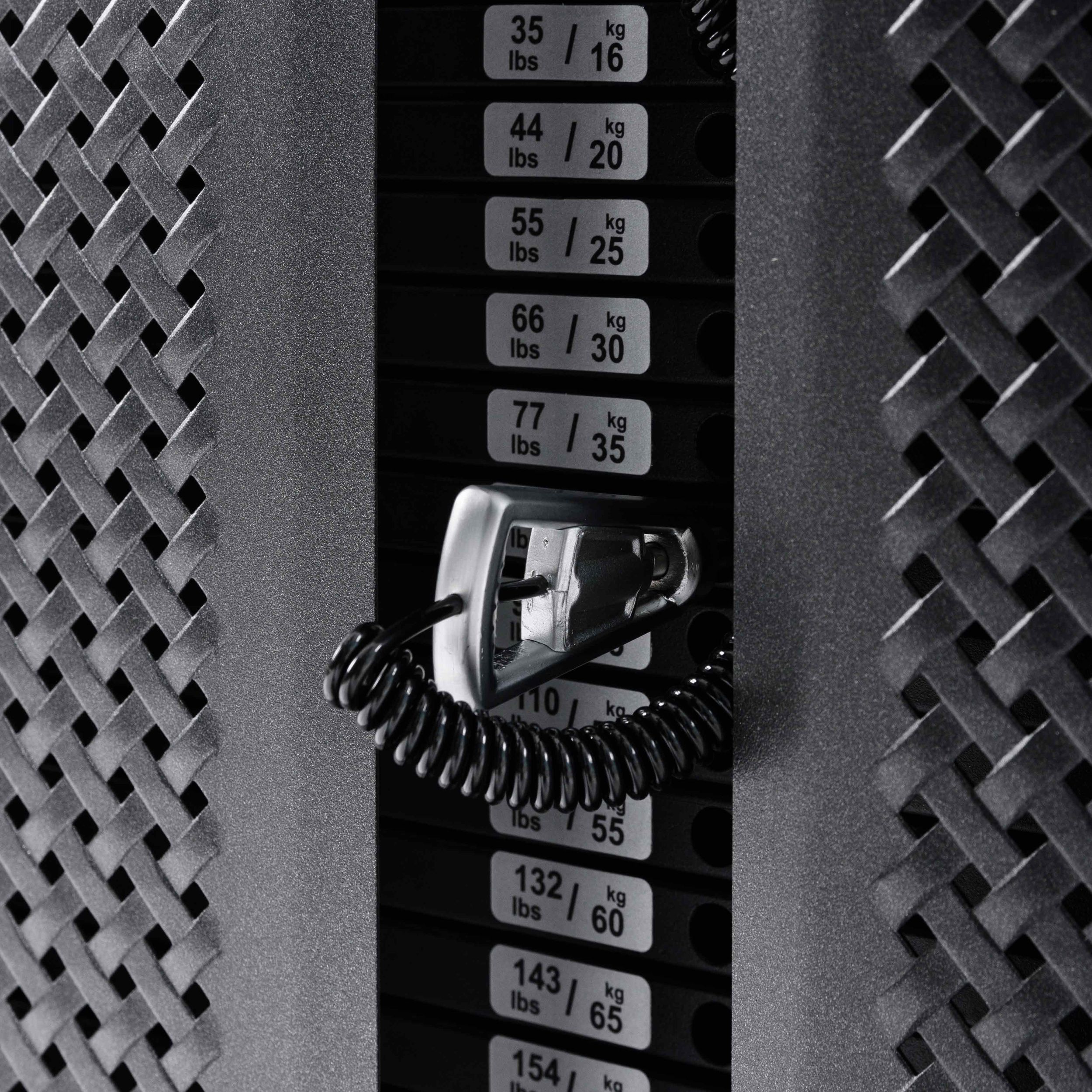 Металлическая перфорированная защита весового стека с лицевой стороны и сплошная защита с задней стороны выполнена из листового металла толщиной 2 мм. Ребра жесткости у основания, примыкающие к несущей раме через скрытое болтовое соединение сечением 6 мм в восьми точках, повышают эксплуатационные параметры тренажера.