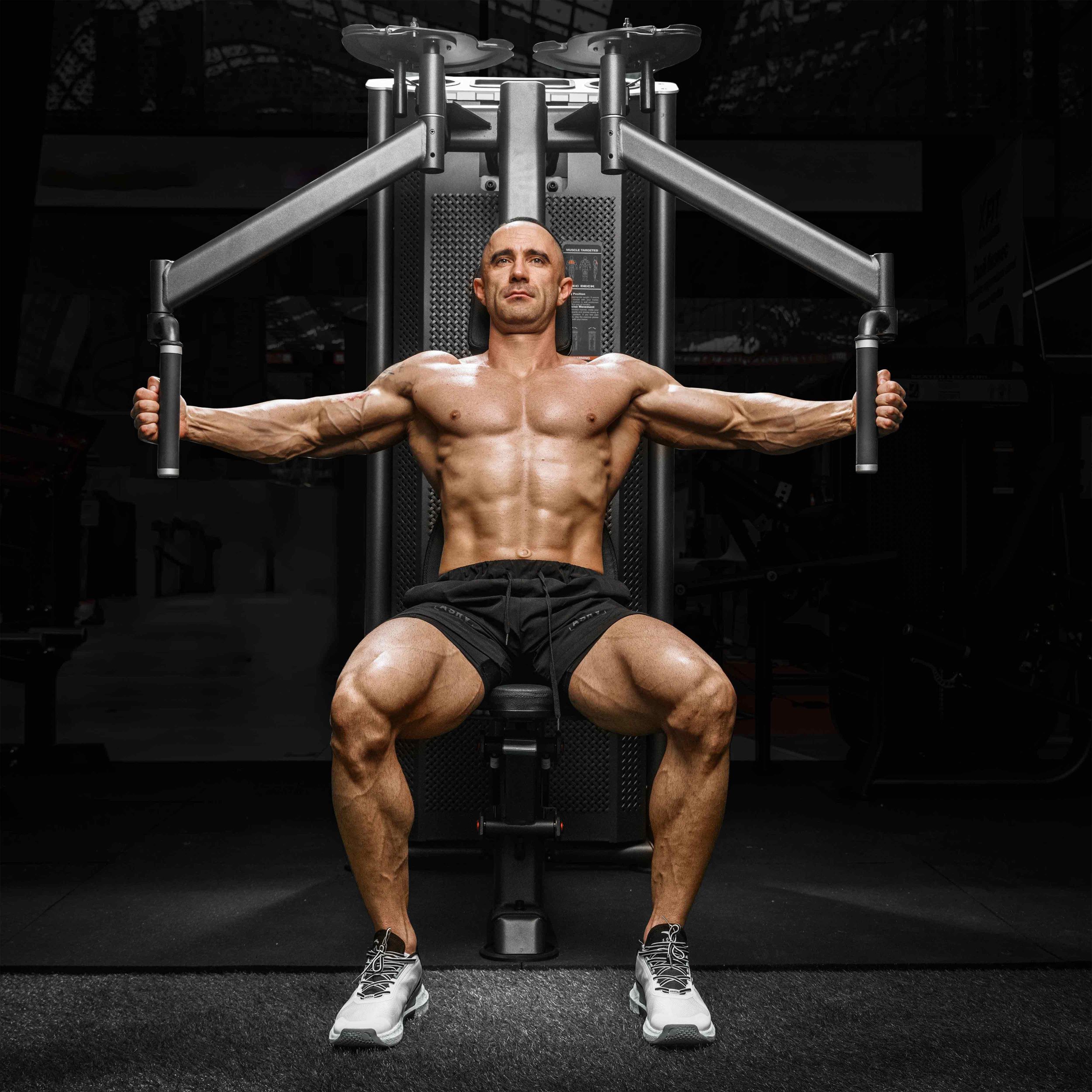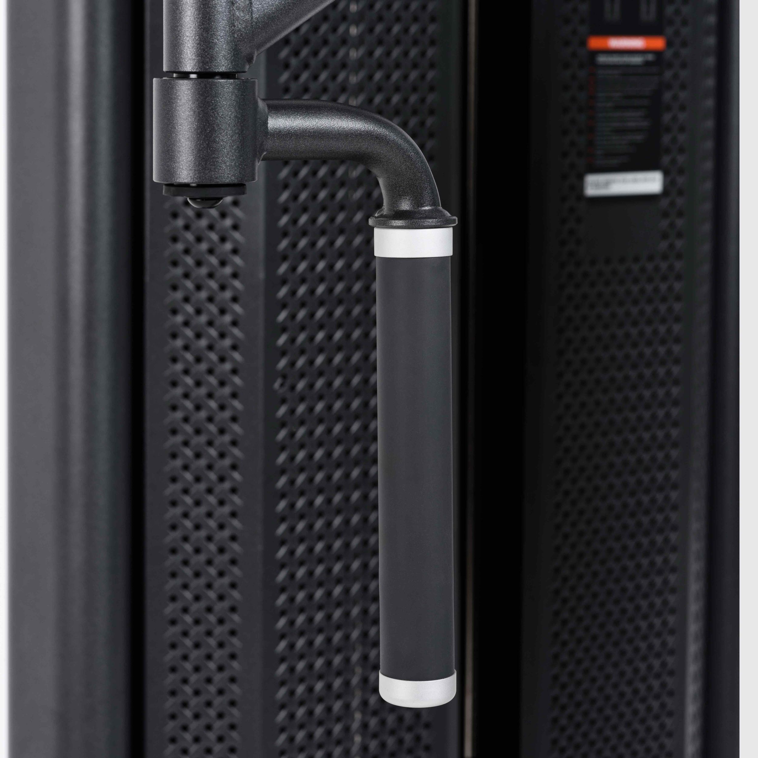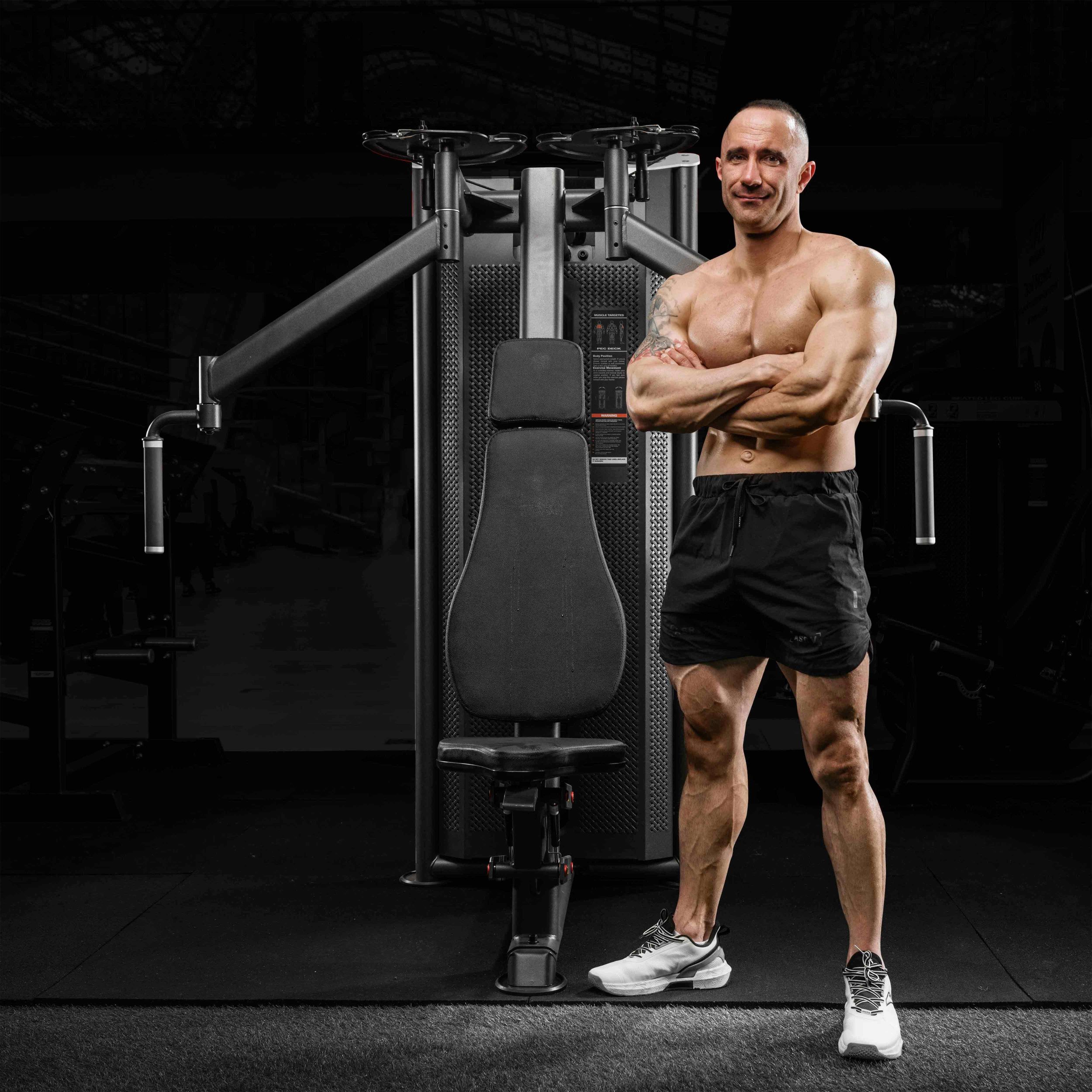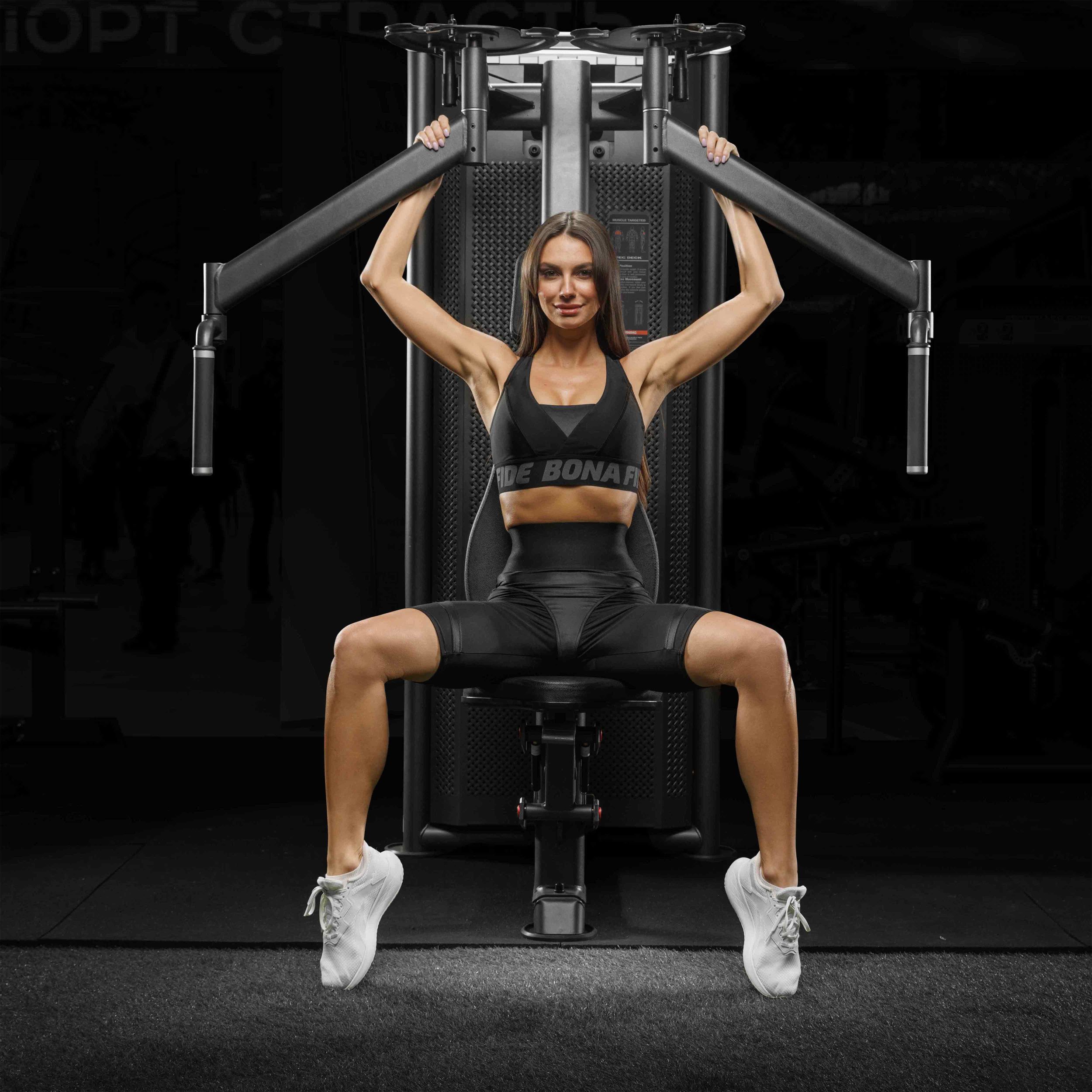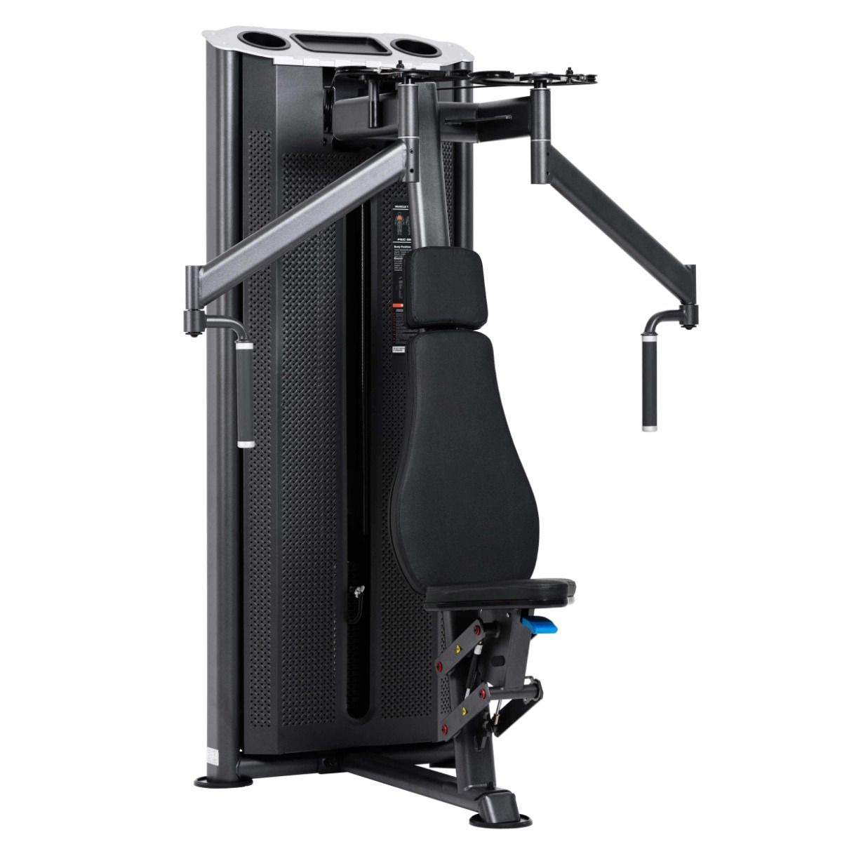 Металлическая перфорированная защита весового стека с лицевой стороны и сплошная защита с задней стороны выполнена из листового металла толщиной 2 мм. Ребра жесткости у основания, примыкающие к несущей раме через скрытое болтовое соединение сечением 6 мм в восьми точках, повышают эксплуатационные параметры тренажера.