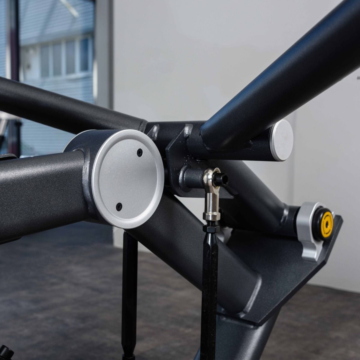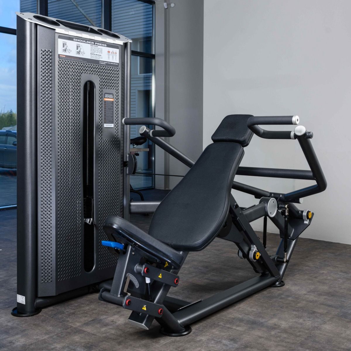 Металлическая перфорированная защита весового стека с лицевой стороны и сплошная защита с задней стороны выполнена из листового металла толщиной 2 мм. Ребра жесткости у основания, примыкающие к несущей раме через скрытое болтовое соединение сечением 6 мм в восьми точках, повышают эксплуатационные параметры тренажера.