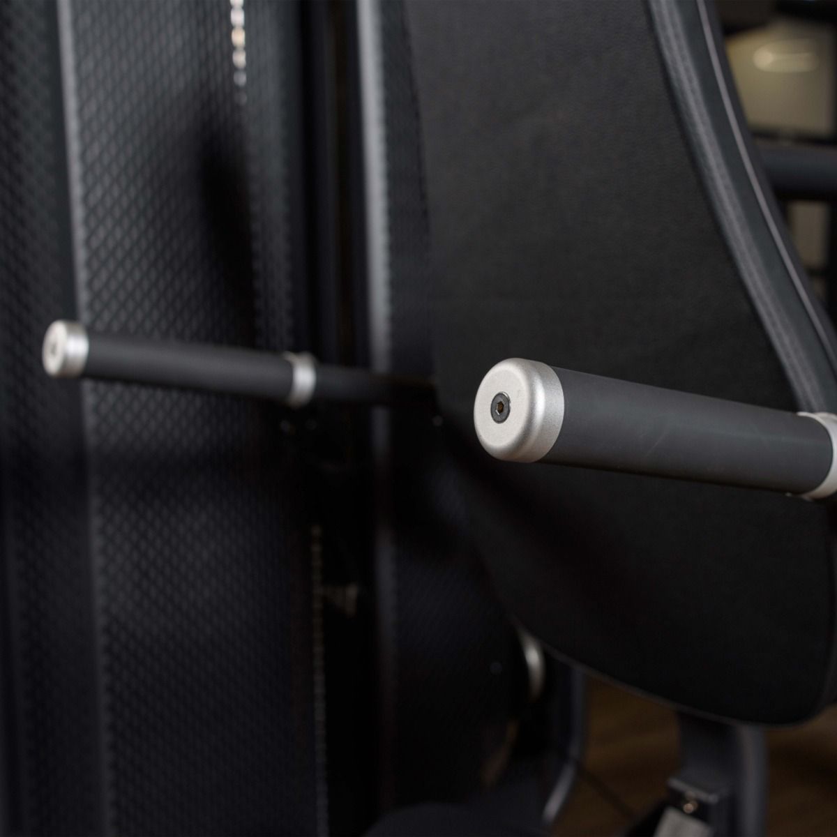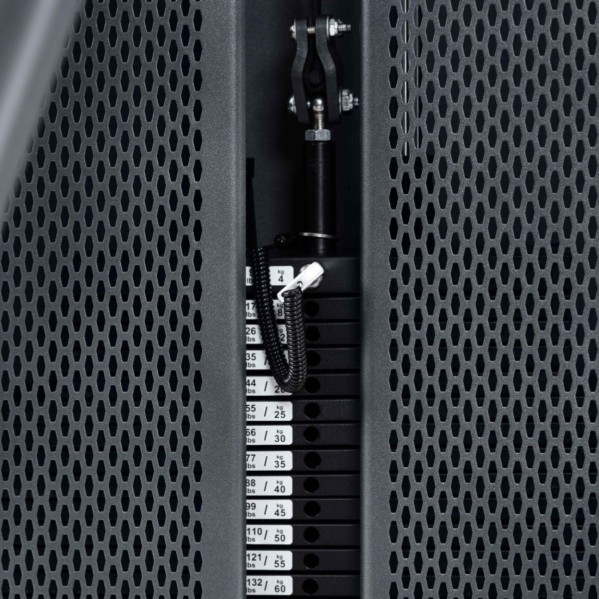 Прорезь в защитном кожухе грузоблока для доступа к регулировке нагрузки шлифованная с завальцованными внутрь гранями по всему периметру для безопасного доступа к весовому стеку и обеспечения дополнительной жёсткости рамы грузоблока.