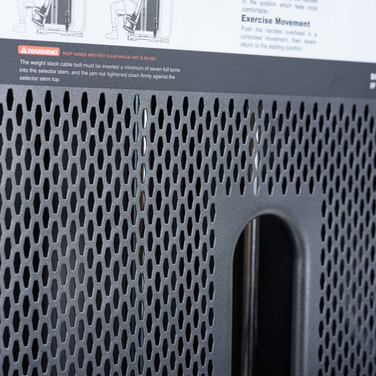 Металлическая перфорированная защита весового стека с лицевой стороны и сплошная защита с внешней стороны выполнена из листового металла толщиной 2 мм. Для повышения эксплуатационных параметров тренажера в восьми точках у основания установлены ребра жесткости, примыкающие к несущей раме через скрытое болтовое соединение сечением 6 мм.