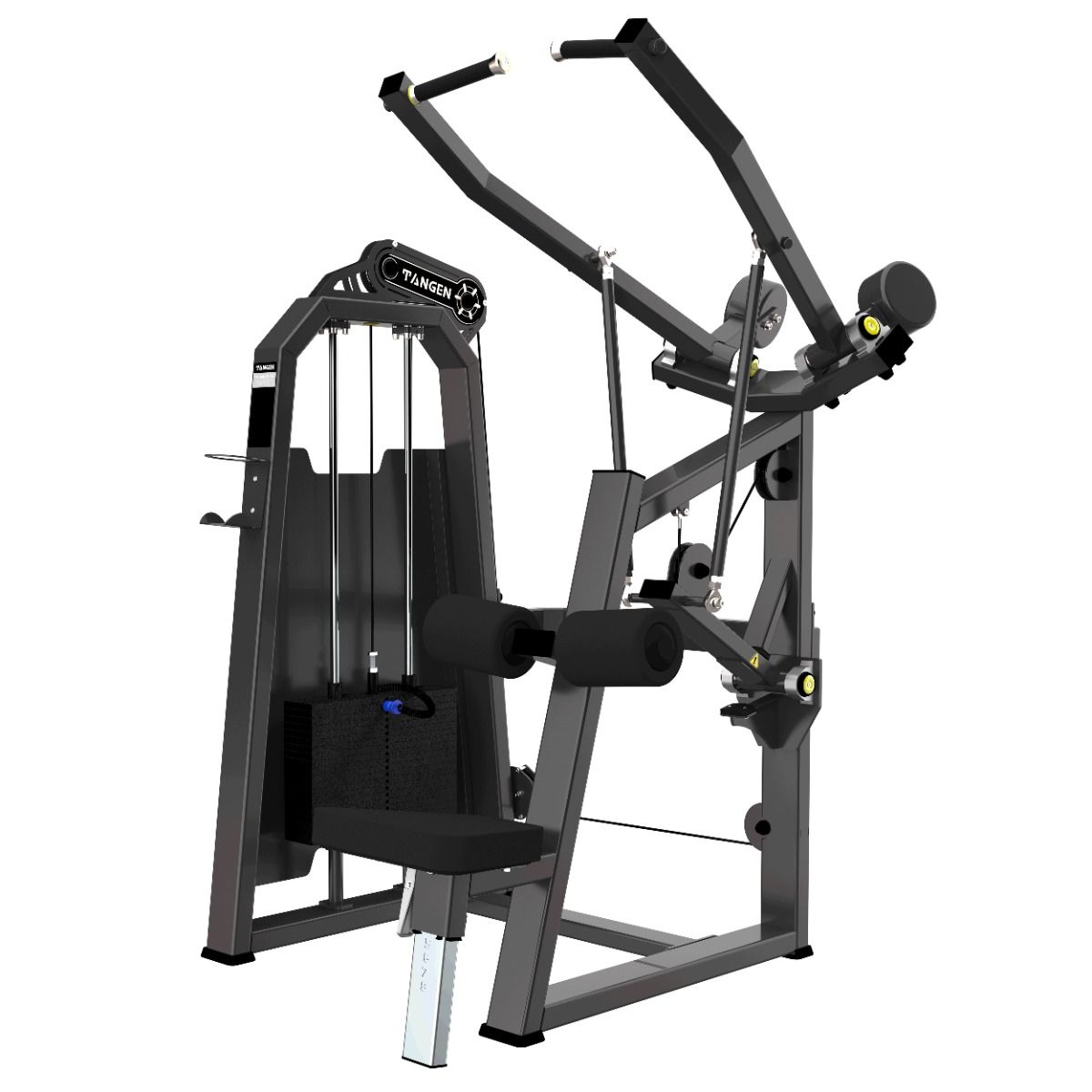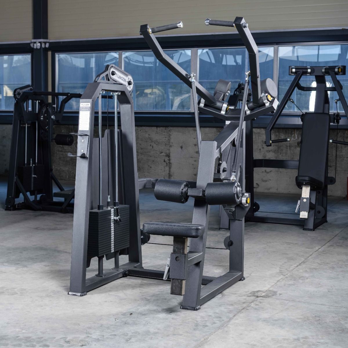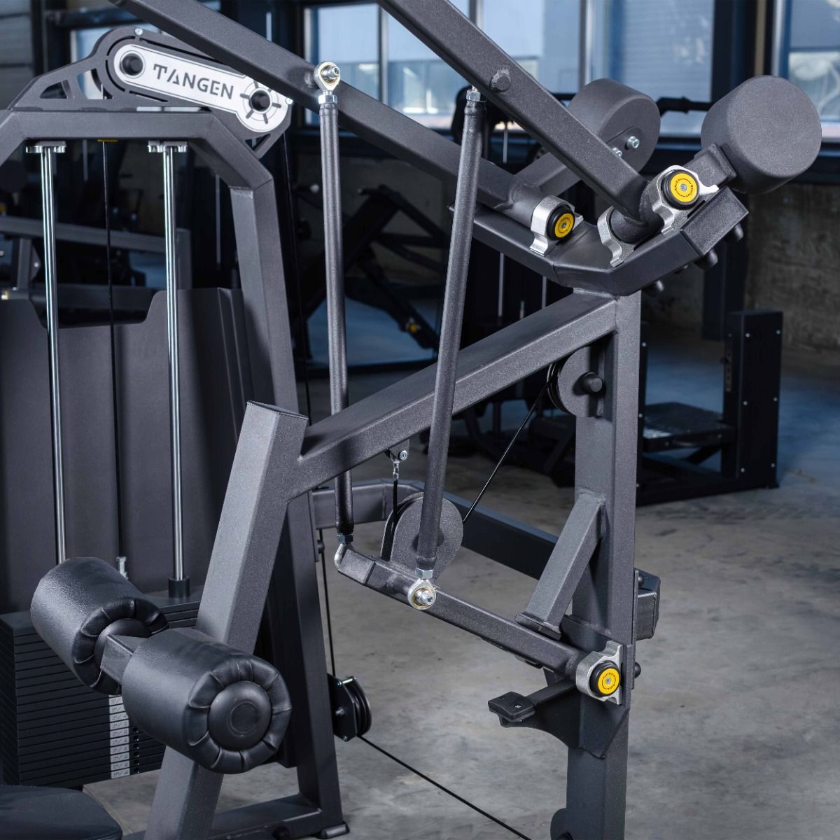 Система нагрузки – тросовая, с весовым стеком 100 кг. Весовой стек выполнен из стальных плит с порошковым покрытием.