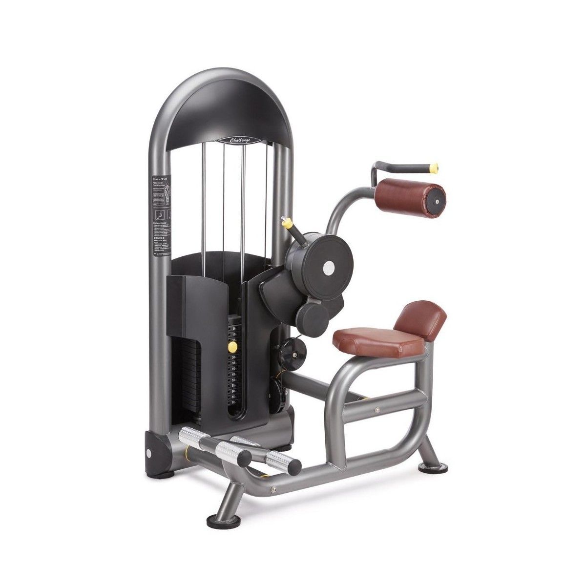 - На боковой раме весового стека размещен плакат с упражнениями на этом тренажере, тренируемыми мышцами.