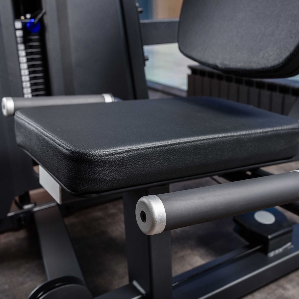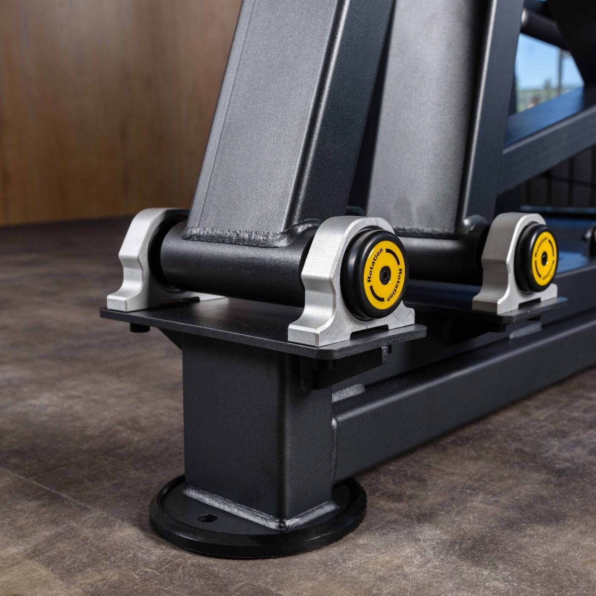 Нескользящие прочные рукоятки с резиновым покрытием с декоративными заглушками – наконечниками зафиксированные болтом, расположены под оптимальным углом для надежной фиксации тела атлета во время тренировки.