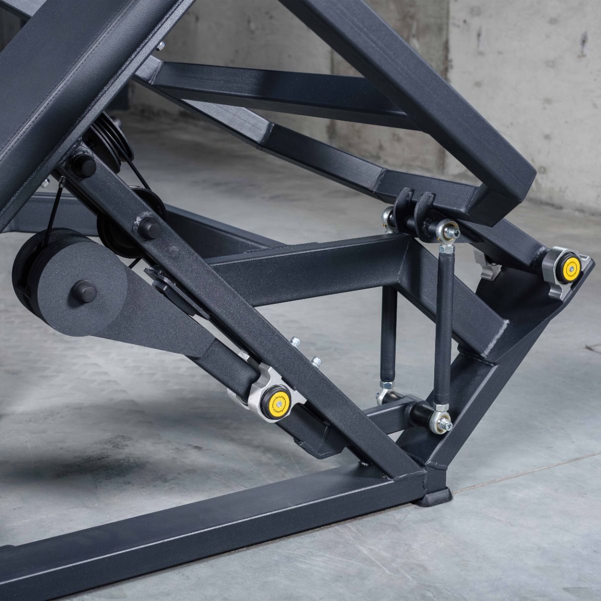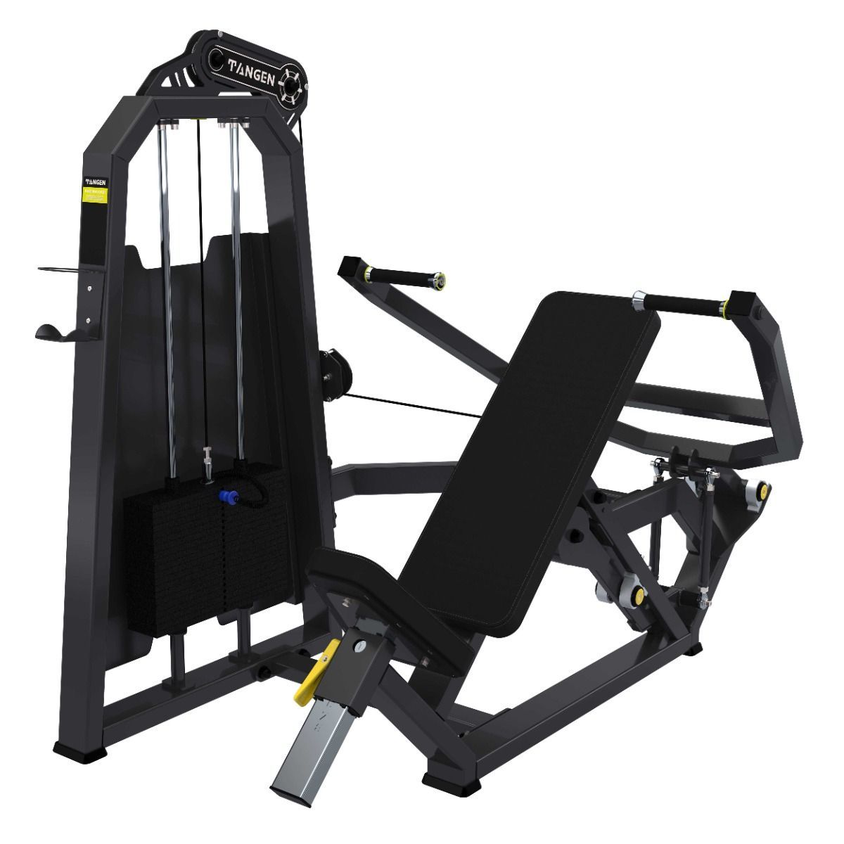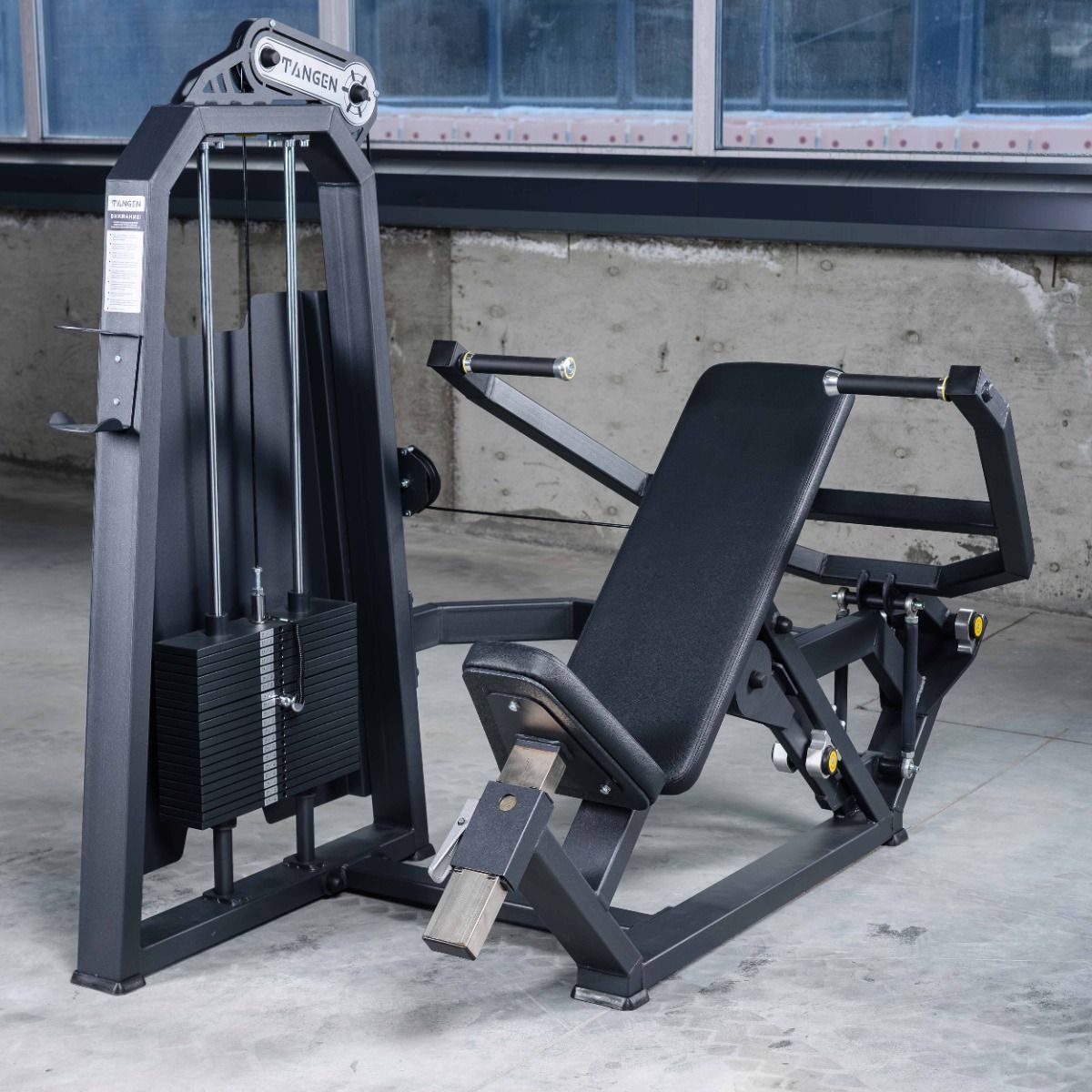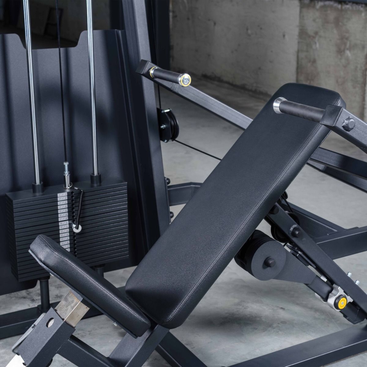 Система нагрузки – тросовая, с весовым стеком 100 кг. Весовой стек выполнен из стальных плит с порошковым покрытием.