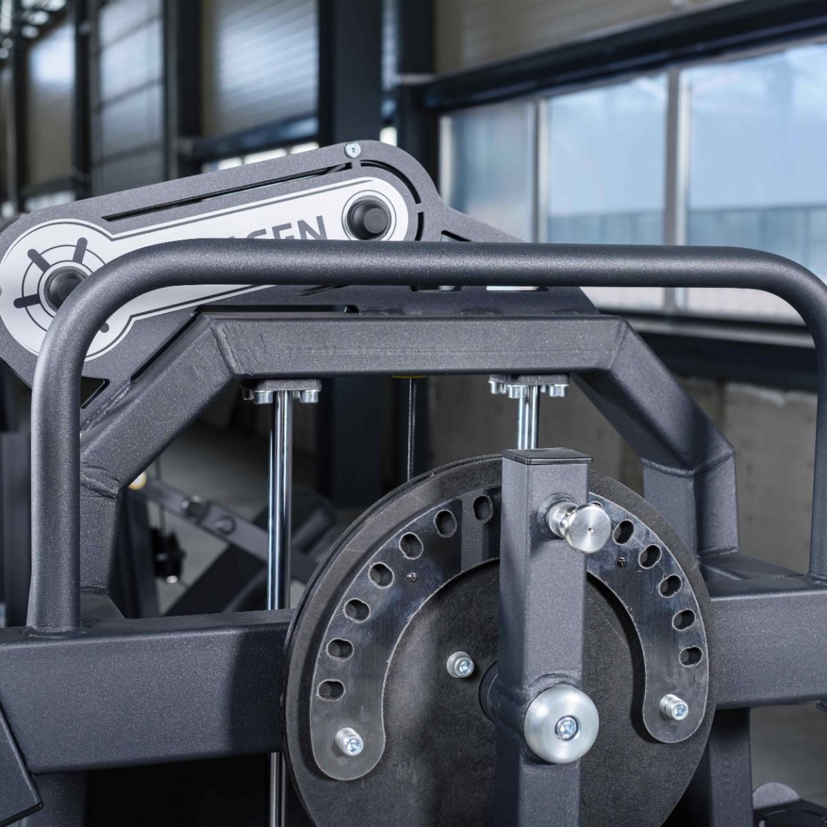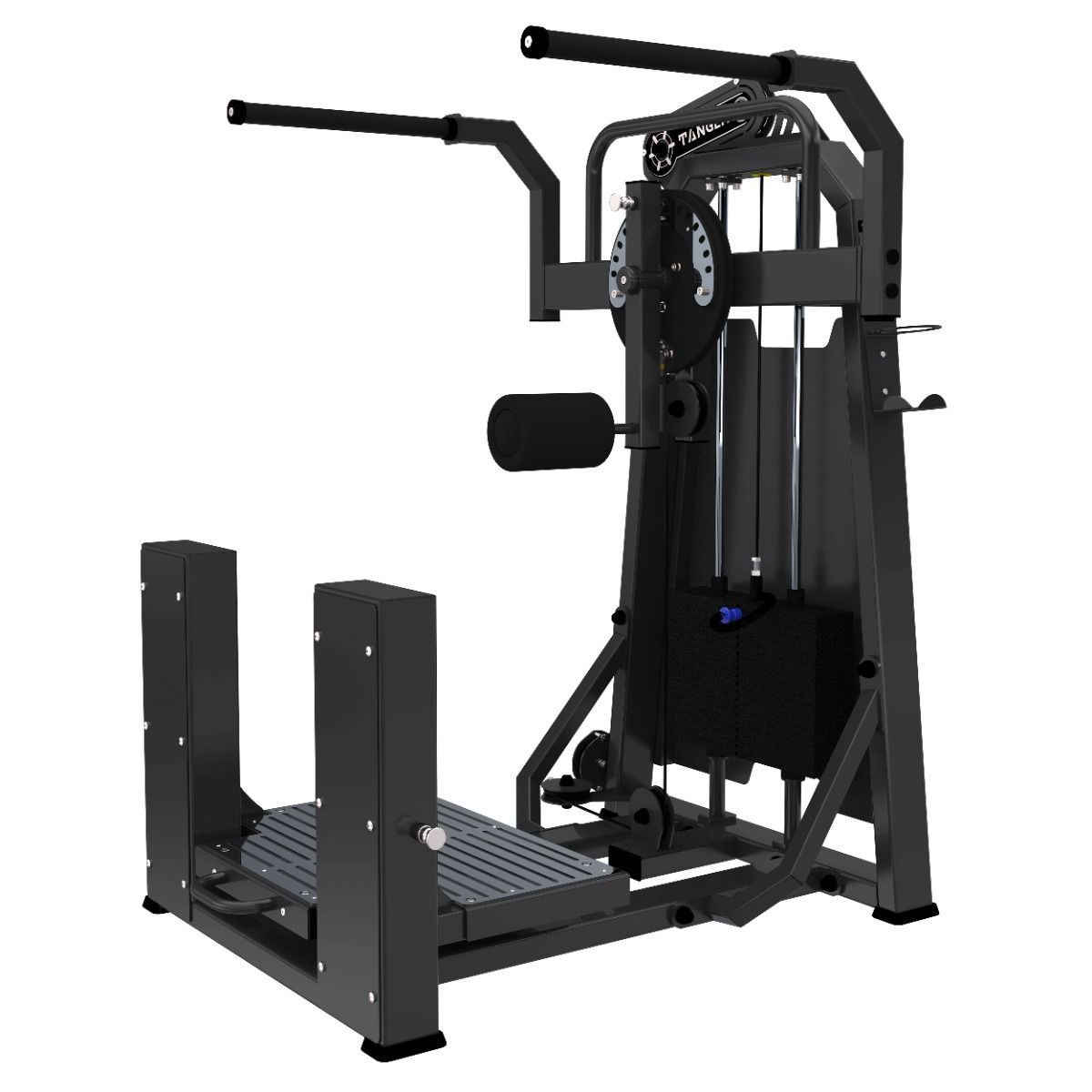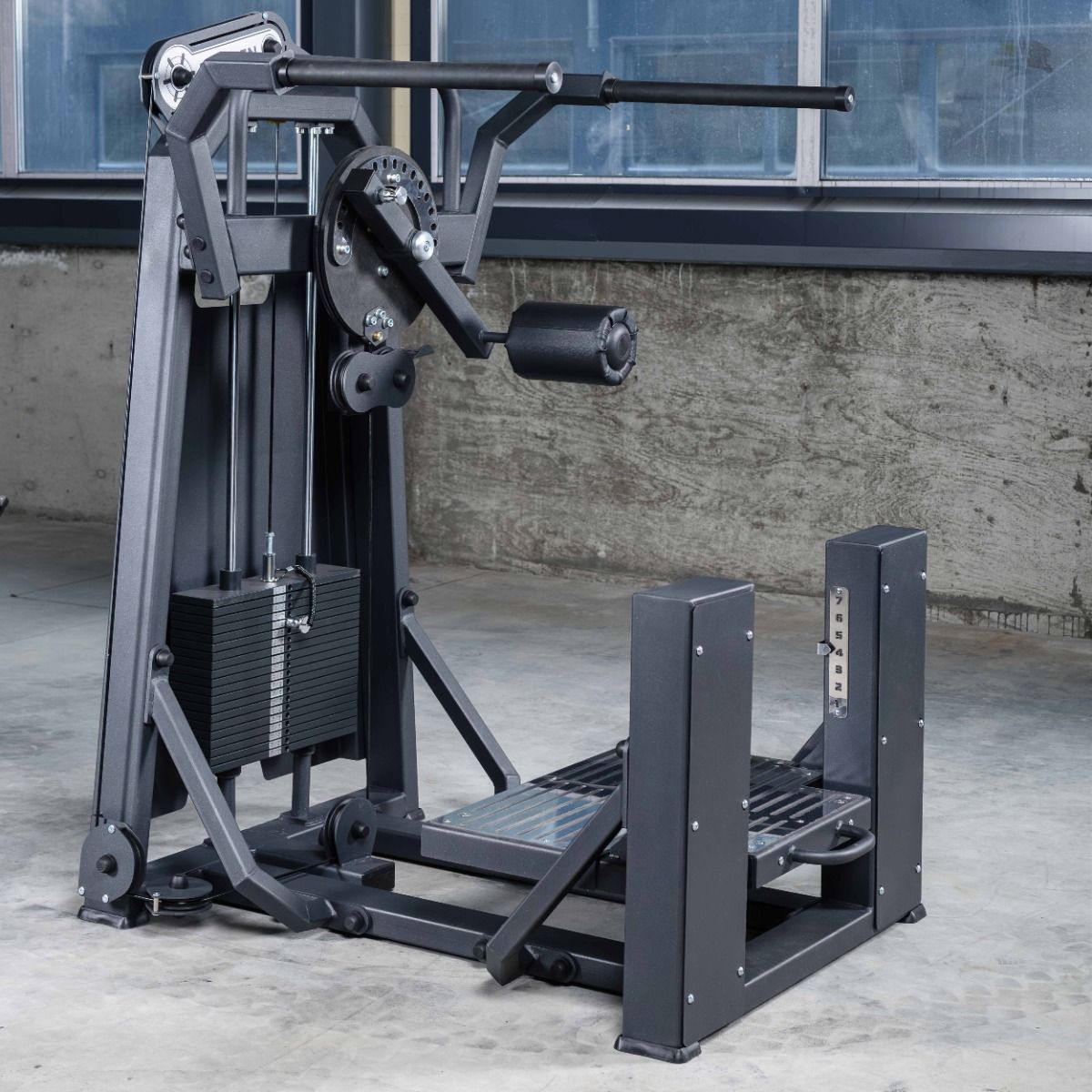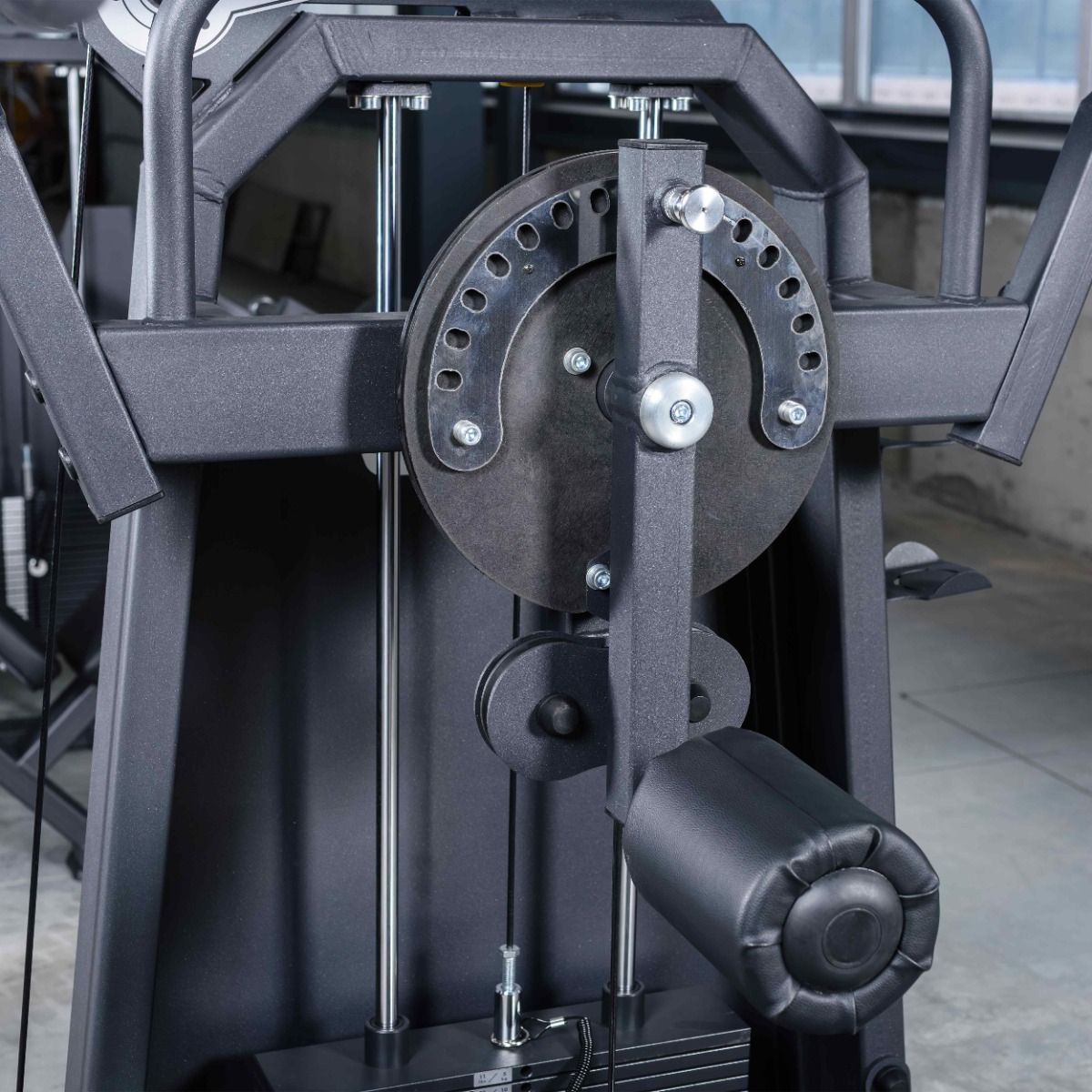 Система нагрузки – тросовая, с весовым стеком 100 кг. Весовой стек выполнен из стальных плит с порошковым покрытием.